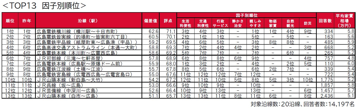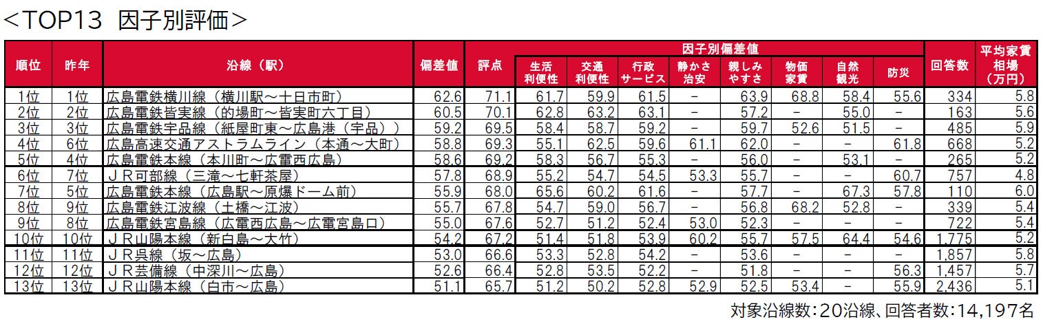 - 街の住みここち沿線ランキング2022<広島県版> TOP13の因子別評価