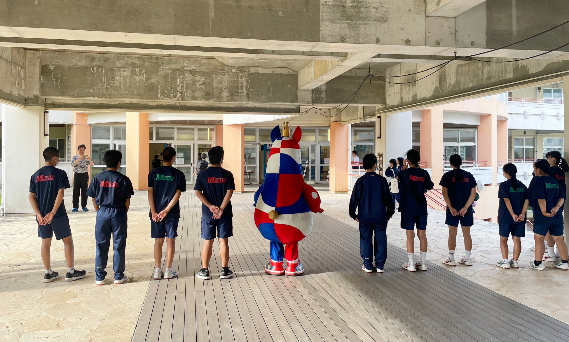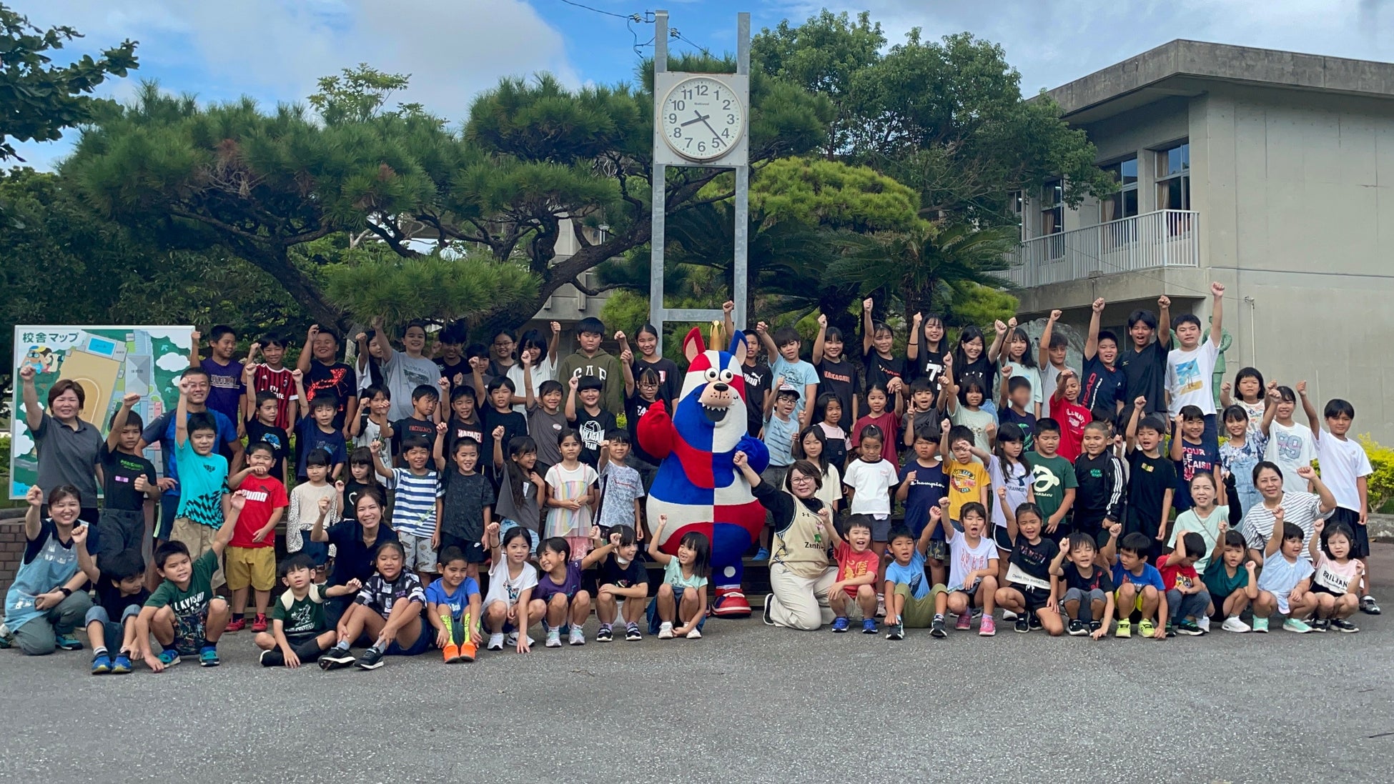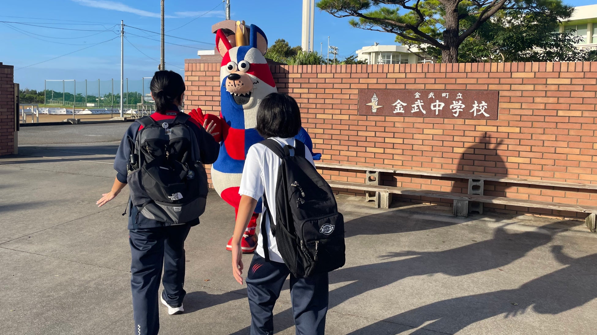 「おおきなわ」の活動の一環として行なっている「ゴーディーによる朝のあいさつ運動」にて、8月・9月はホームタウン沖縄市の他、宜野湾市、読谷村、恩納村、宜野座村、糸満市の小中学校のあいさつ運動に参加しました。
