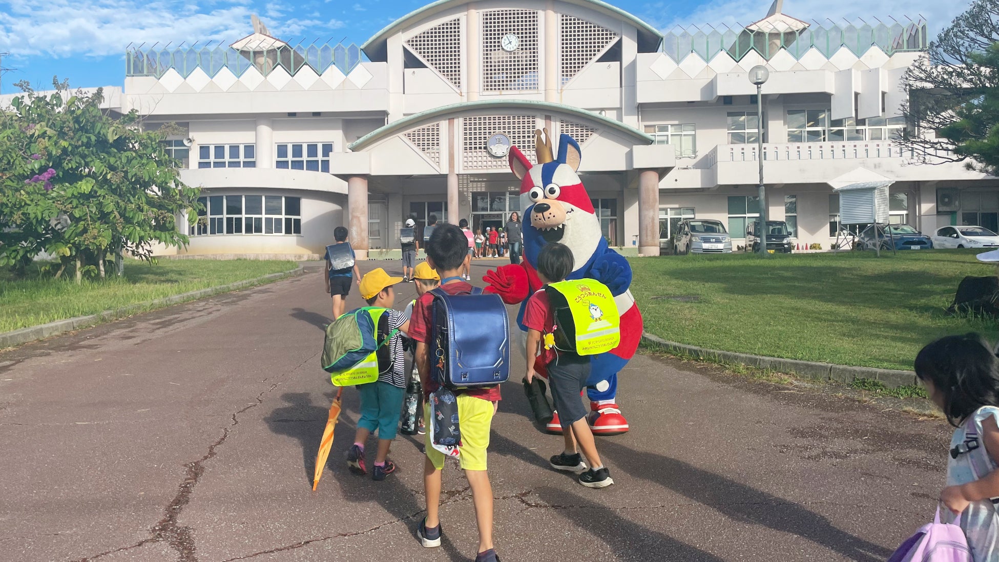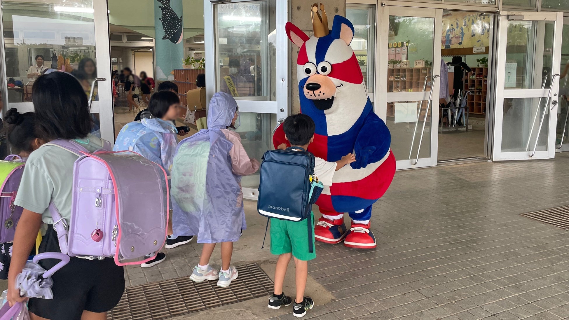小中学校を訪問したゴーディーは、登校する子どもたちとあいさつを交わし、一緒に写真を撮るなどして交流しました。
