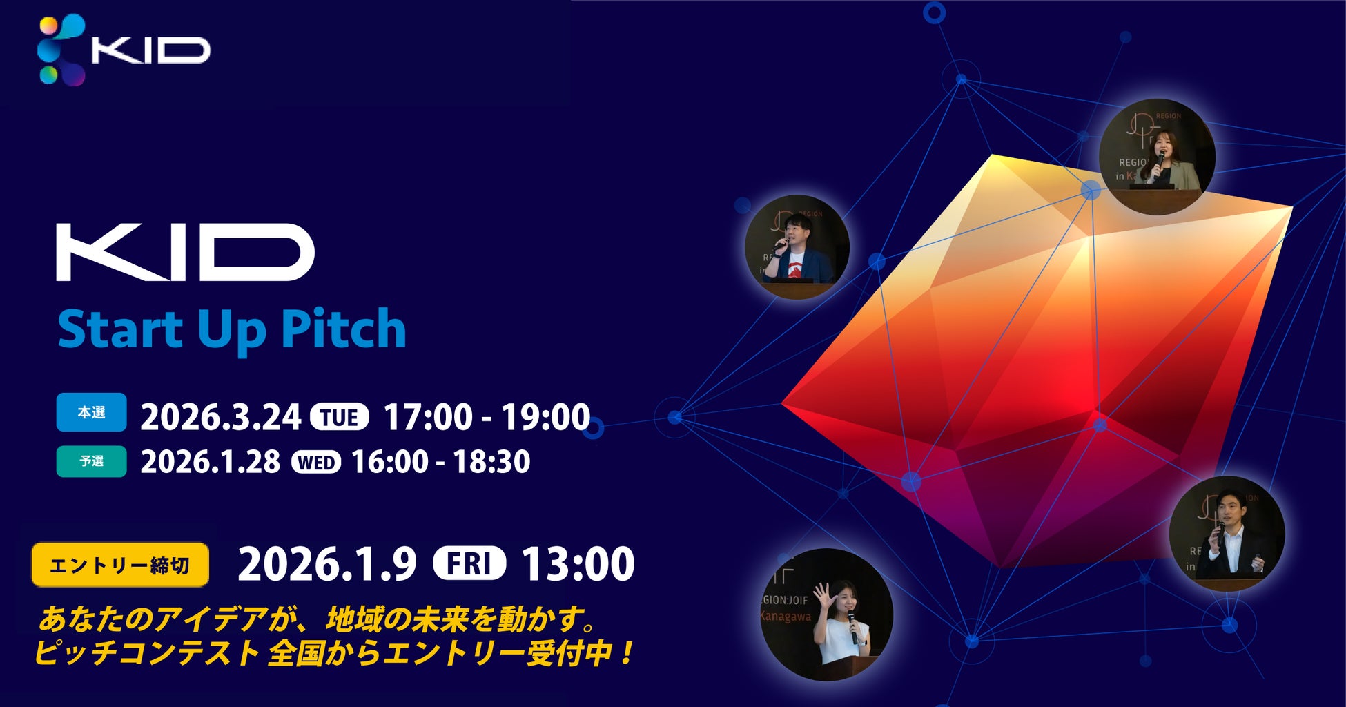 スタートアップ・ベンチャー、大企業・地場企業、自治体、投資家・金融機関、支援機関が出会い、可能性と情熱が交差する。新たな未来を紡ぎ出す1日。略称『KID2026』。