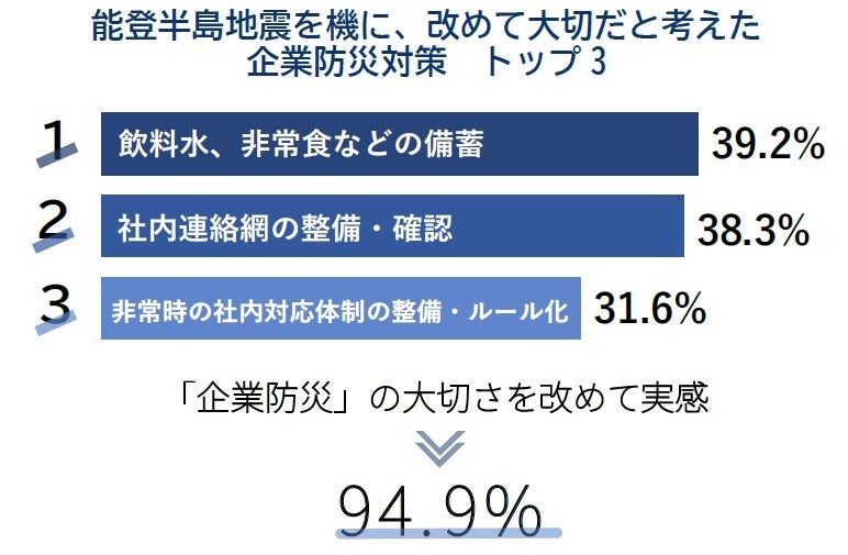 企業の94.9%が今回の地震を機に「企業防災」の大切さを改めて実感。なかでも「飲食料備蓄」「連絡網の整備」が4割近くで上位。「BCP策定・見直し」は5社に1社