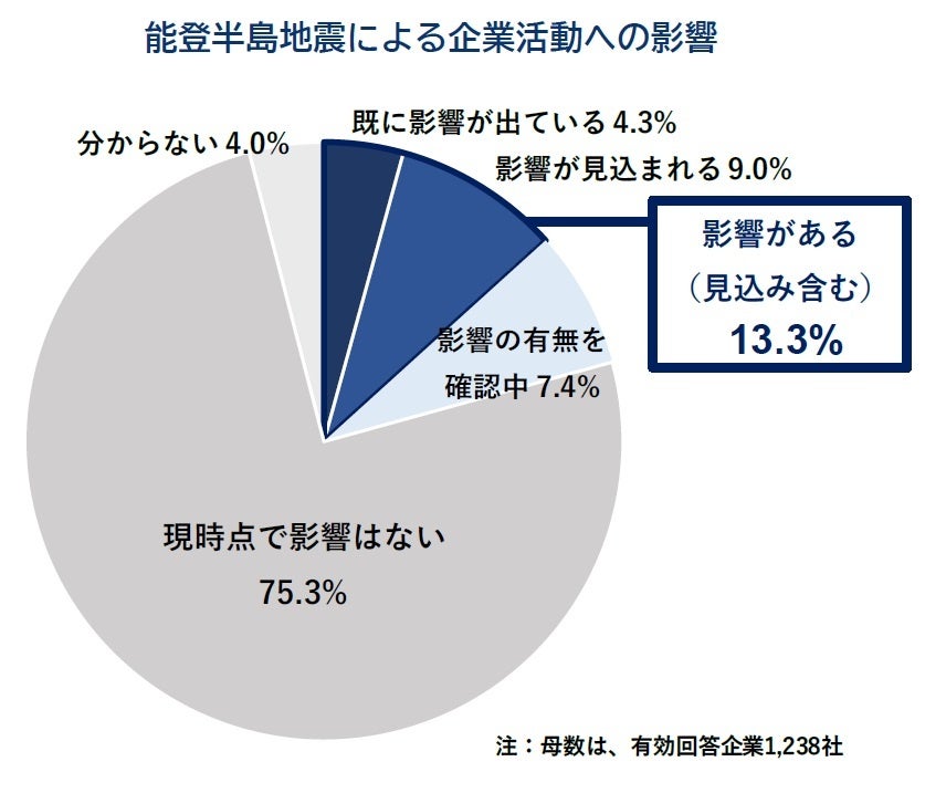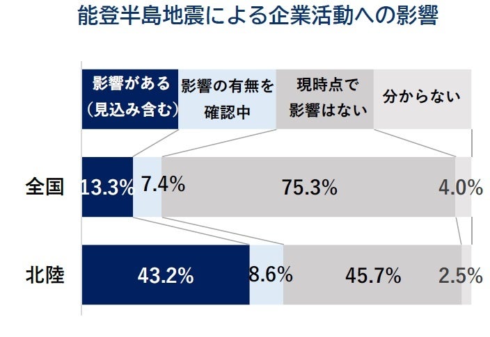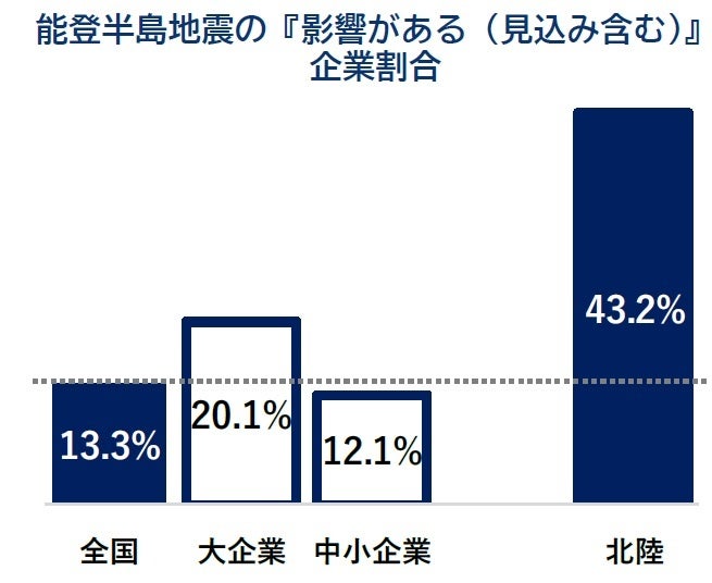 能登半島地震による自社の企業活動への影響について、『影響がある(見込み含む)』企業は13.3%。『北陸』では43.2%にのぼる