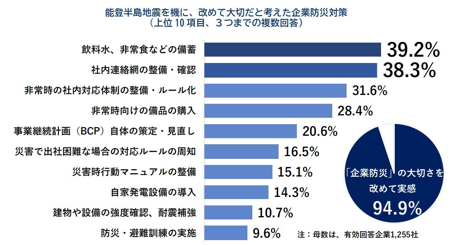 能登半島地震の発生を機に、企業として改めて大切だと考えた防災対策を尋ねたところ、「飲料水、非常食などの備蓄」が39.2%でトップとなった(複数回答3つまで、以下同)。次いで「社内連絡網の整備・確認」(38.3%)が続き、「非常時の社内対応体制の整備・ルール化」(31.6%)や「非常時向けの備品の購入」(28.4%)などが上位に並んだ。また、「事業継続計画(BCP)自体の策定・見直し」(20.6%)は5社に1社となった。