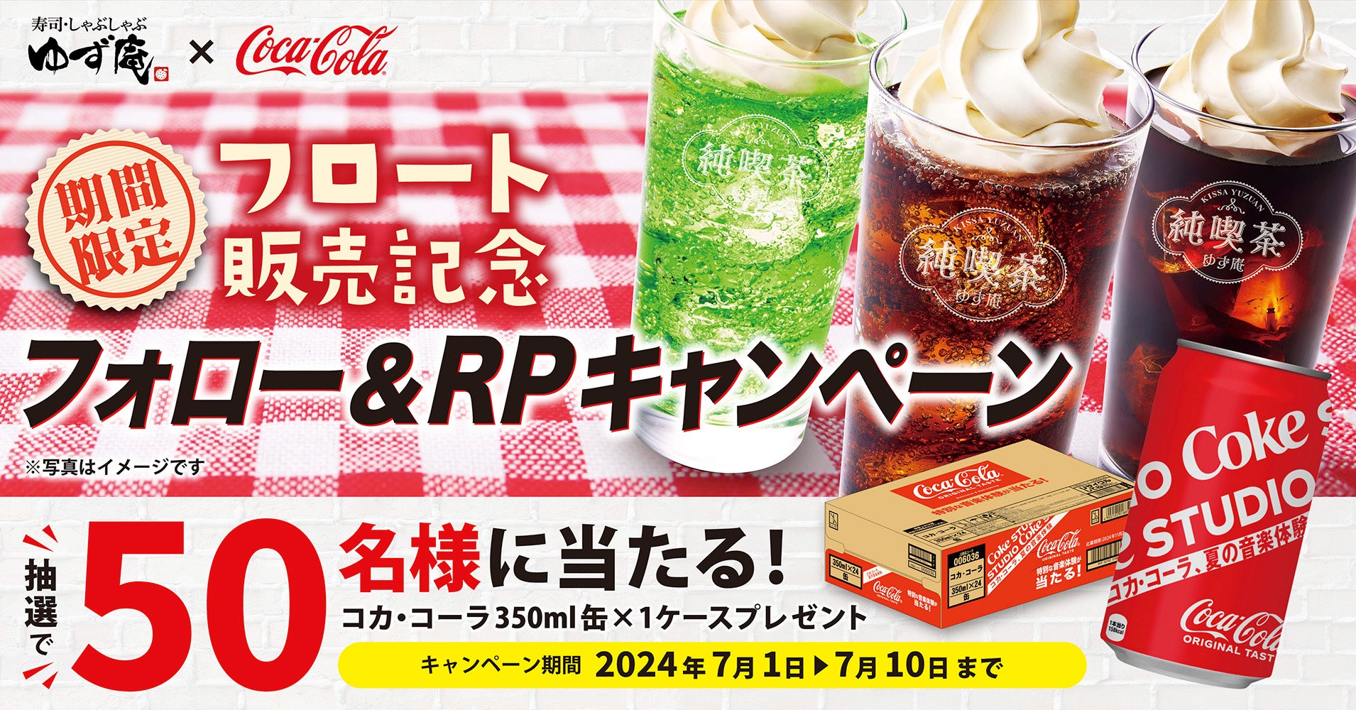 株式会社物語コーポレーション(本社:愛知県豊橋市/代表取締役社長:加藤 央之)が全国97店舗展開する『寿司・しゃぶしゃぶ ゆず庵』(以下、ゆず庵)は、「フロート」の販売を記念して、公式X(旧Twitter)にて「コカ・コーラ350ml缶 1ケース」が当たるプレゼントキャンペーンを開催いたします。