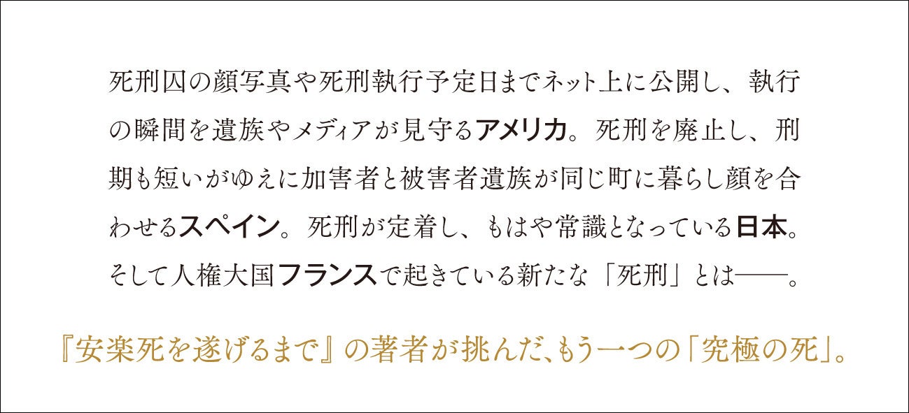 いま、死刑を行なっているのは独裁国家や一部の後進国だけであり、世界は死刑廃止へ向かっています。そうした風潮のなか、先進国の中で死刑制度を維持する二つの国である日本とアメリカは、ずっと批判にさらされてきました。なぜ今、世界中で死刑が廃止に向かいつつあるのか。そのなかで死刑を維持し続ける国には、どんな理由があるのか。一方、実際に死刑を廃止した国では、いま何が起きているのか。アメリカ、フランス、スペイン、日本を訪れ、死刑囚や未決囚、仮釈放中の殺人犯、被害者遺族、加害者家族などに丹念に取材を重ね、死刑の意味に迫っていきます。