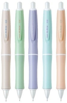 (左から)シャープペンシル「モノグラフ」、「モノグラフライト」、消しゴム「モノ」、 修正テープ「モノポケット」、ホルダー消しゴム「モノワン」