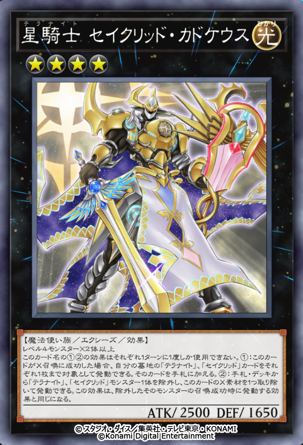 このカード名の①②の効果はそれぞれ1ターンに1度しか使用できない。①:このカードがX召喚に成功した場合、自分の墓地の「テラナイト」、「セイクリッド」カードをそれぞれ1枚まで対象として発動できる。そのカードを手札に加える。②:手札・デッキから「テラナイト」、「セイクリッド」モンスター1体を除外し、このカードのX素材を1つ取り除いて発動できる。この効果は、除外したそのモンスターの召喚成功時に発動する効果と同じになる。