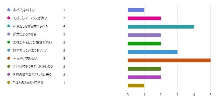 最も多くの票を集めたのは『三元豚がおいしい』というポイントでした。2位は『味変をしながら食べられる』、3位は『無料だしで〆までおいしい』でした。