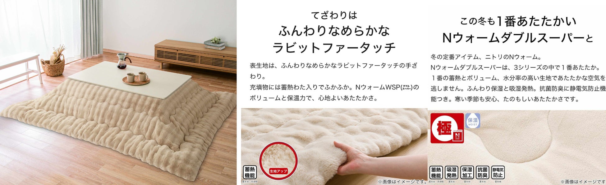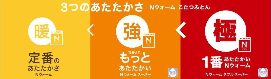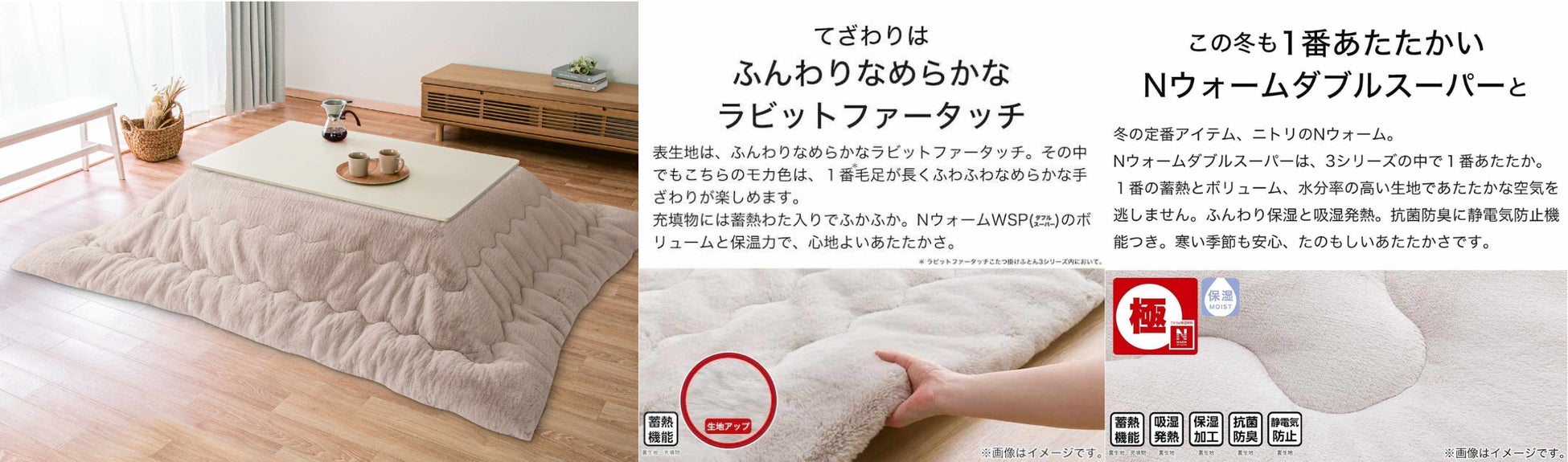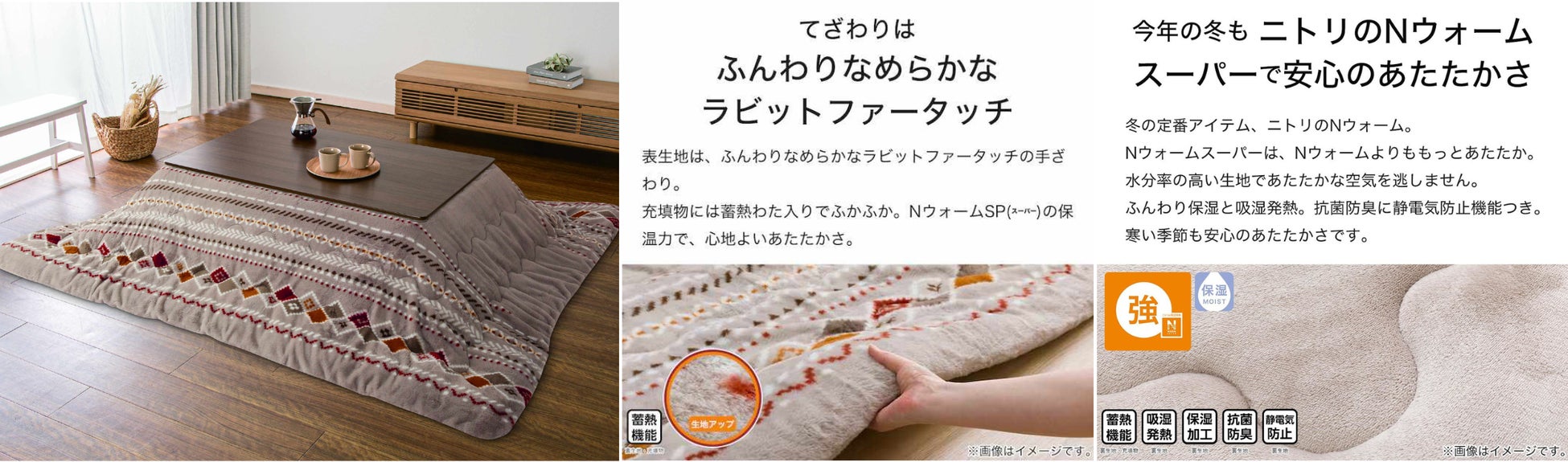 ニトリのこたつ掛ふとんは、人気のNウォームシリーズのうち定番のあたたかさ「Nウォーム」、もっとあたたかい「Nウォームスーパー」、1番あたたかい「NウォームW(ダブル)スーパー」の3シリーズを色柄豊富に多数ご用意しております。