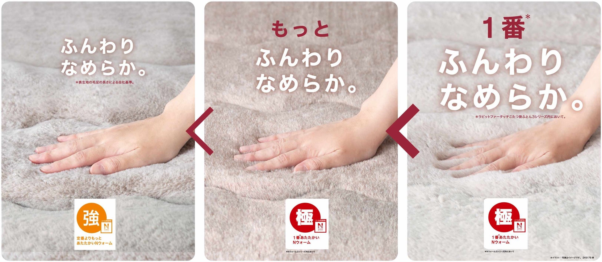 今年は、肌ざわりの良さにこだわった「ふんわりなめらか」ラビットファータッチシリーズに加え、「もっとふんわりなめらか」、「1番ふんわりなめらか」なより極上の肌ざわりのシリーズをバージョンアップして全国のニトリ店舗およびニトリネットにて取り扱いを開始しました。
