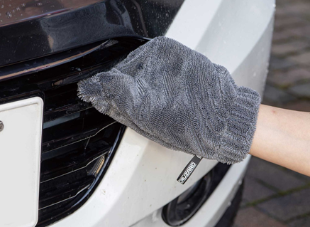 手袋タイプで、フロントグリルや、バイザーの隙間など、手の届きにくい細かな箇所の水滴まで残さずスッキリ吸収します。