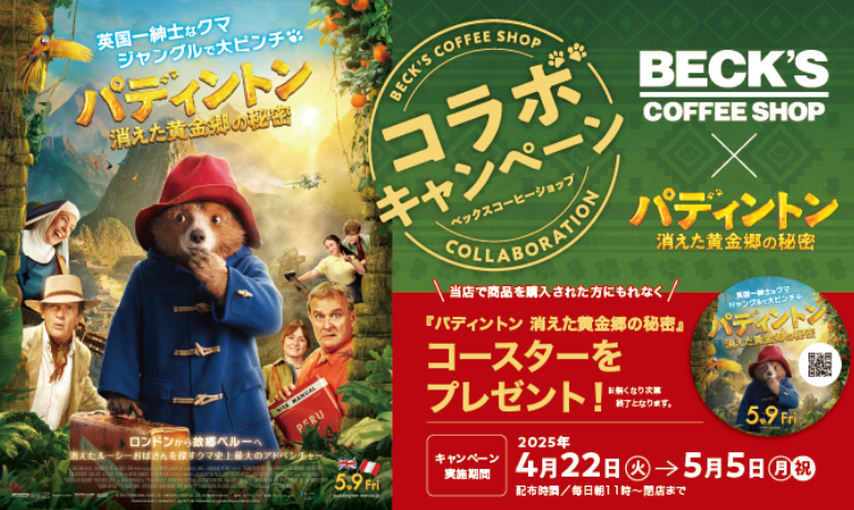 株式会社JR東日本クロスステーション フーズカンパニー(本社:東京都渋谷区、代表取締役社長:西野 史尚)は、長年世界中で愛され続ける映画『パディントン』のシリーズ3作目『パディントン 消えた黄金郷の秘密』の公開を記念して、4月22日(火)から、ベックスコーヒーショップ30店舗にてコラボプレゼントキャンペーンを開催いたします。今回のキャンペーンでは、商品をご購入いただいたお客さまへ映画『パディントン 消えた黄金郷の秘密』オリジナルコースターをプレゼントすることに加えて、ベックスコーヒーショップ公式Xでデジタル映画観賞券(ムビチケ)が抽選で当たるSNSキャンペーンを実施いたします。