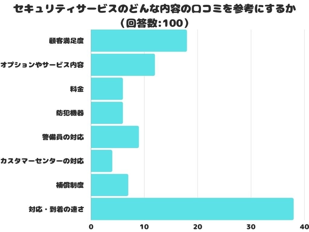 セキュリティサービスのどんな内容の口コミを参考にするかをアンケートにて調査したところ、1位は「対応・到着の速さ」でした。