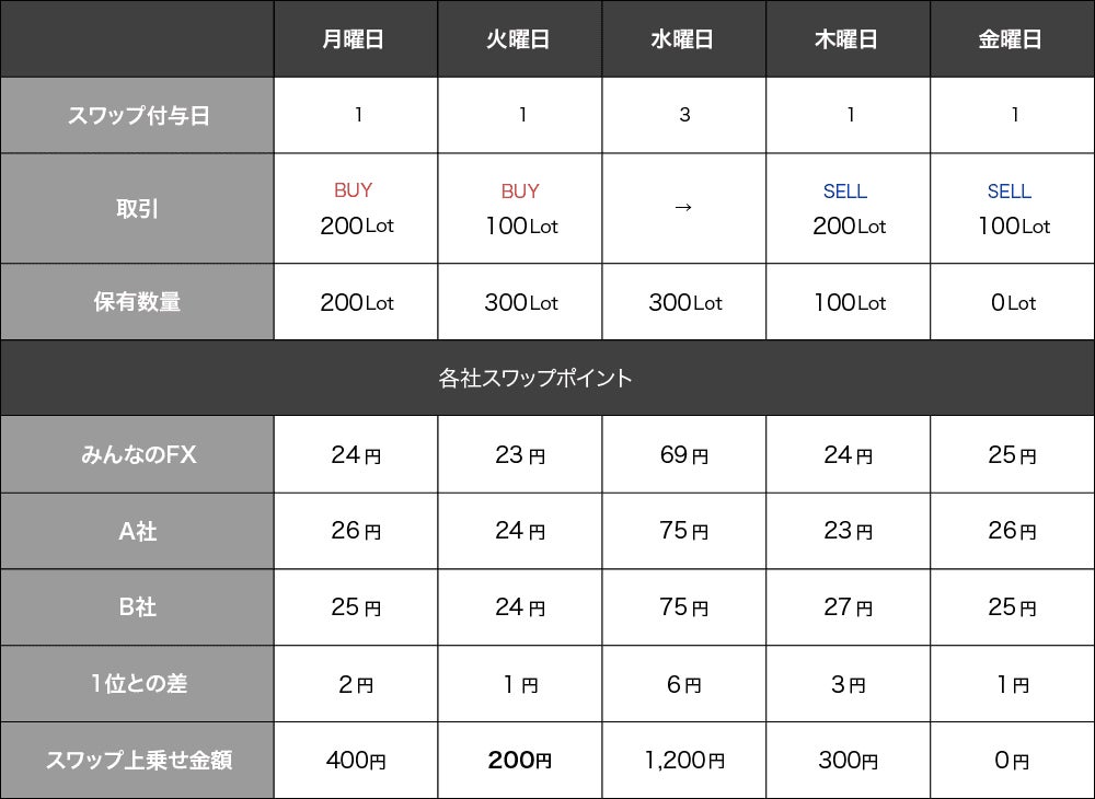 【例】対象通貨ペアを月曜日に200Lot新規買い、火曜日に100Lotを追加で新規買い、木曜日に200Lotを一部決済、金曜日に全決済した場合