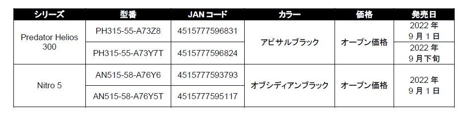 日本エイサー株式会社(本社:東京都新宿区、代表取締役社長:ボブ・セン)は、コアなゲーマーに向けた最上位ゲーミングブランドPredator(プレデター)より、ゲーミングノートパソコン Predator Helios 300の新モデル 2機種「PH315-55-A73Z8」「PH315-55-A73Y7T」を、さらにカジュアルゲーマーからコアゲーマーまで幅広いゲーマーに向けたゲーミングブランドNitro (ニトロ)からは、ゲーミングノートパソコン Nitro 5の新モデル 2機種「AN515-58-A76Y6」「AN515-58-A76Y5T」を発売します。Predator Helios 300 「PH315-55-A73Z8」とNitro 5 の2機種は本日2022年9月1日(木)に発売。Predator Helios 300 「PH315-55-A73Y7T」は9月下旬発売予定です。