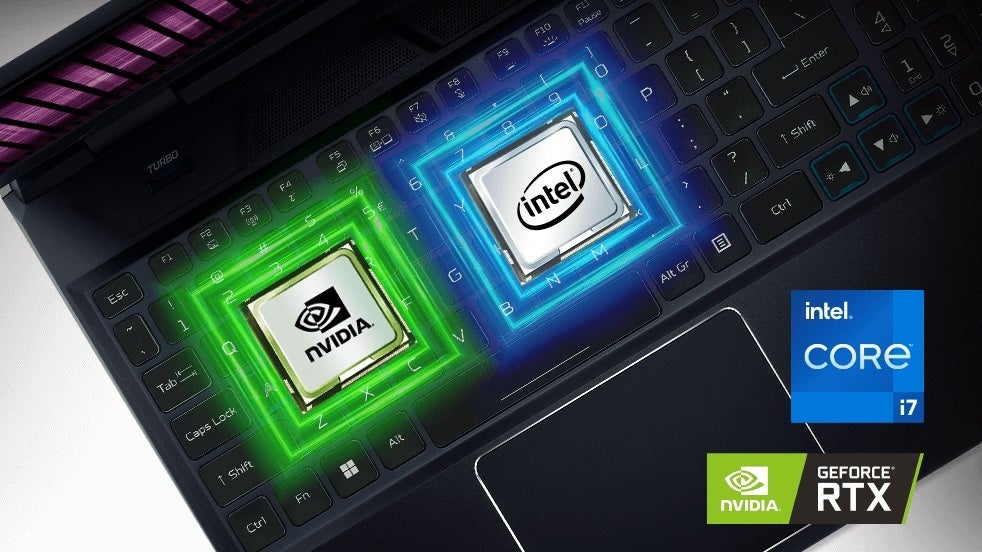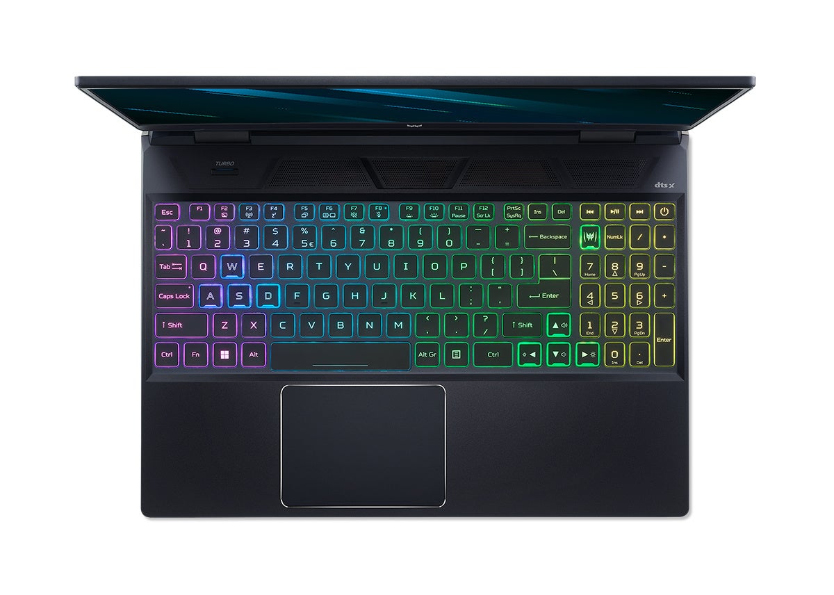 また、2つの専用キーである、独自機能のシステム設定アプリPredatorSenseにアクセスが可能なPredatorSenseキーと、Turboキーを配置。Predatorロゴを配したPredatorSenseキーは、PC動作音の制御、冷却ファンのコントロールやキーボードのバックライト色の設定などのシステム設定へアクセスが可能。さらに、本モデルよりキーボードバックライトを一新し、各キーキャップの下に個別のミニLEDを配置。これにより、各キーが個別に点灯してより滑らかなライティングを実現します。Turboキーは、CPU とGPU をフルパワーで動作。ファン速度も最大にし、ゲームをプレイすることができます。