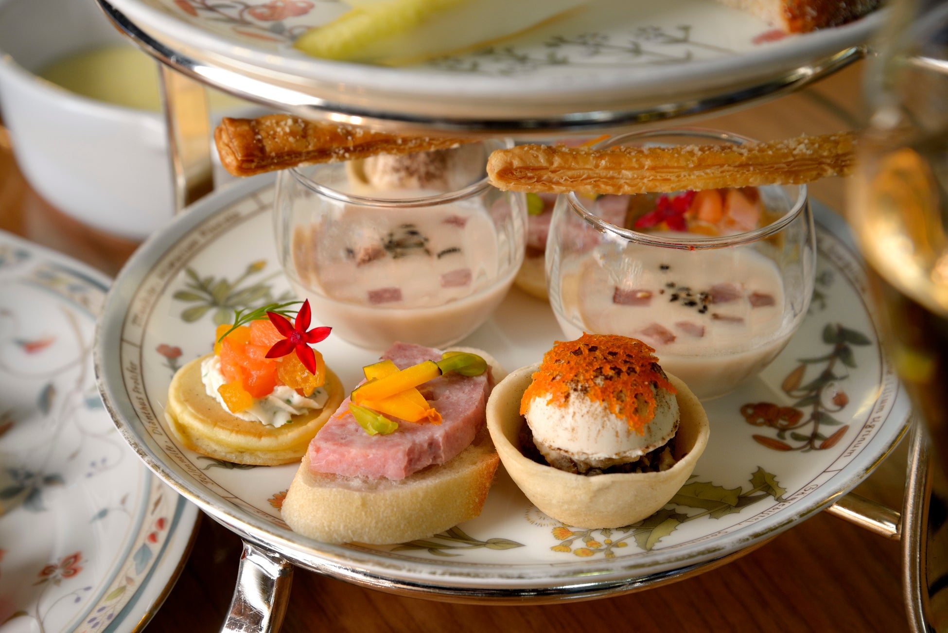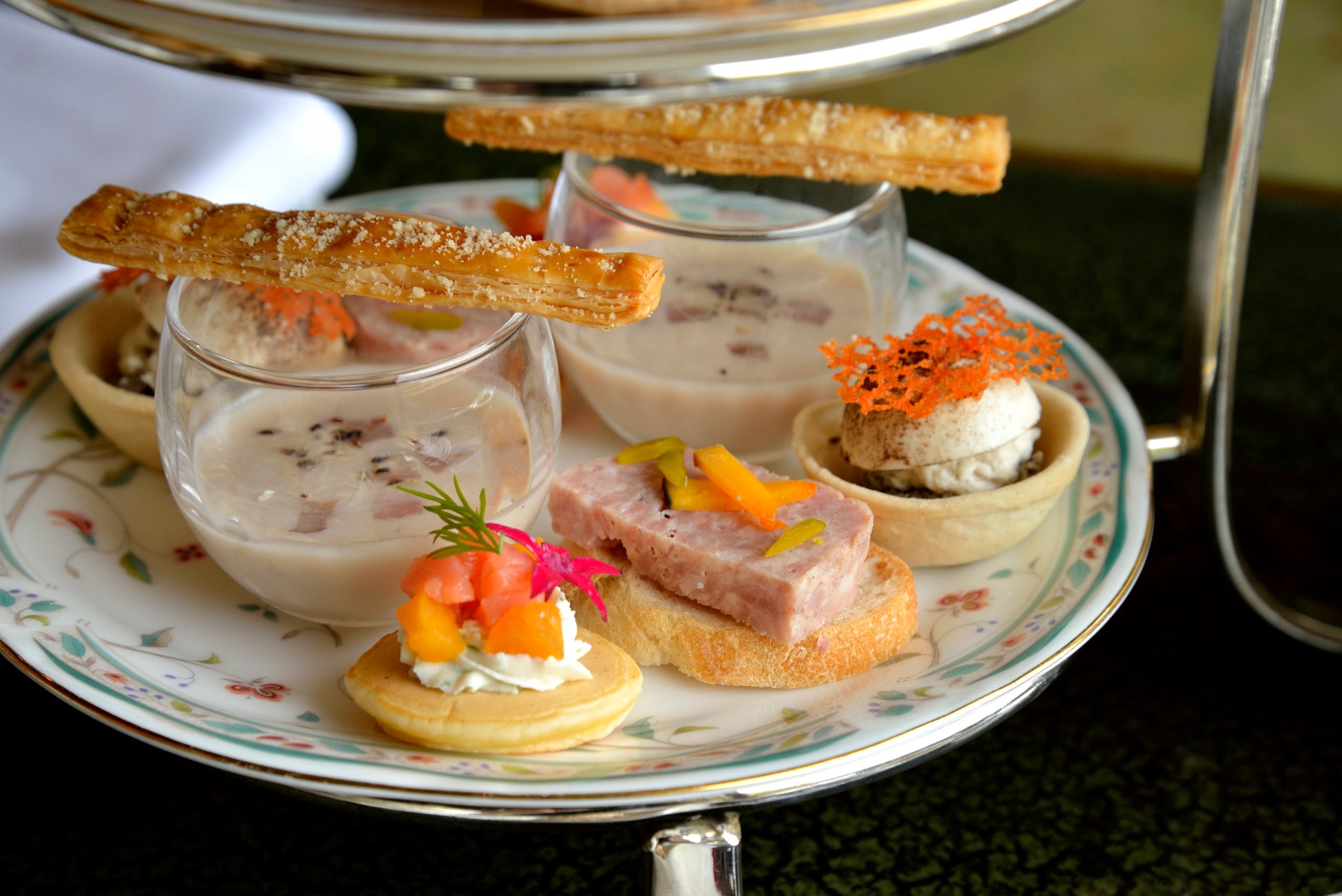 下段のセイボリーは、丁寧にピューレ状にすることで滑らかな舌触りと香りが心地良い「栗のヴルーテ パイスティック添え」、熟した柿のやさしい甘みと、サーモンの塩味が絶妙に調和する「柿とサーモンのパンケーキ」、にんにくで香ばしくソテーしたまいたけ、しめじ、マッシュルームのペーストを詰め込み、上にはふんわりとしたマッシュルームムースをのせ、豊かなキノコの旨みを閉じ込めた「キノコのタルト」など4種を用意しました。