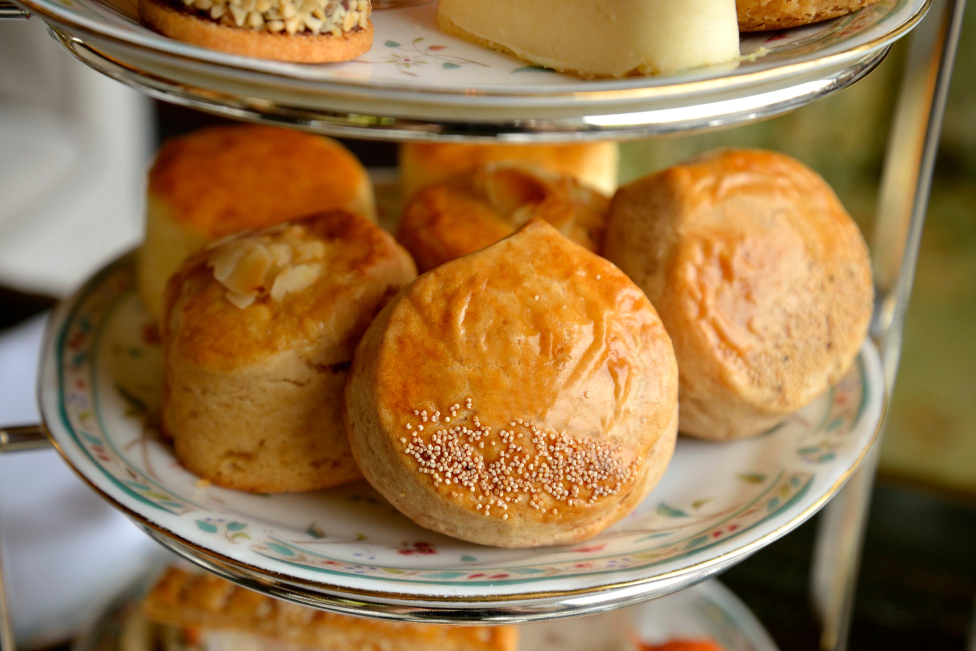 中段のスコーンは、伝統のプレーンスコーンに加え、毎年秋の定番として人気の「栗スコーン」、ドライアップルを贅沢に練り込んだ「アップルシナモンスコーン」の3種をご用意。通常のクロテッドクリームのほか、いちじくのクロテッドクリーム、カシスオレンジのジャムを添えて、風味の違いをお楽しみいただけます。