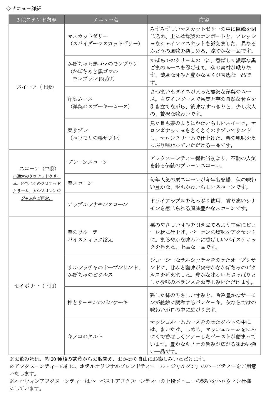 また、10月1日(水)から31日(金)の期間は、上段のスイーツがハロウィン仕様に変化する「ハロウィンアフタヌーンティー」として、季節感と遊び心をさらに演出いたします。