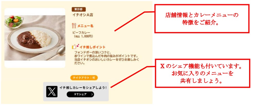 メニューの詳細や店舗情報はもちろん、都道府県別での検索機能や、あなたのイチ推しカレーを共有できるSNS(X)シェア機能も付いています。