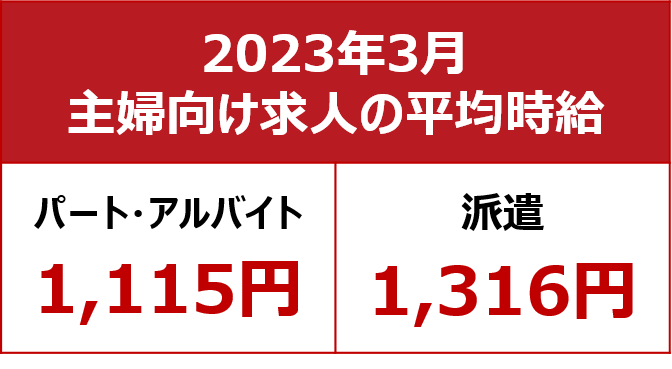 【2023年3月 主婦求人の平均時給】パート・アルバイト:『1,115円』、派遣:『1,316円』