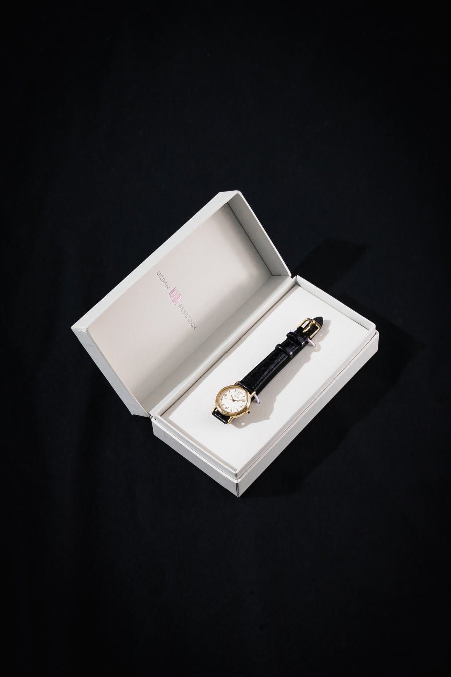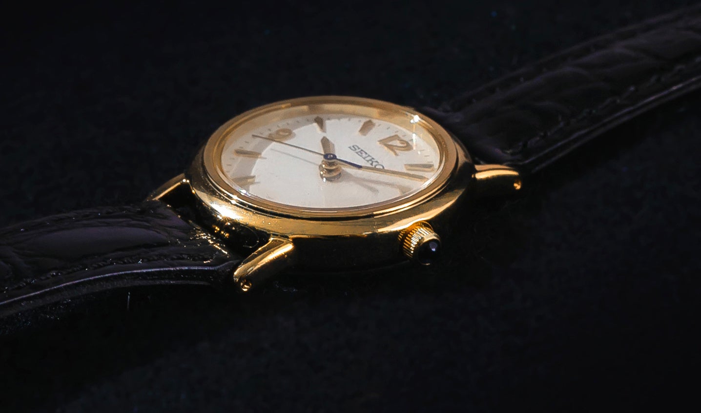肌馴染みのいいアイボリーフェイスにかぶさる丸みを帯びたカーブガラスとリューズの黒ガラスは、クラシックな中にも女性らしさを忘れさせないデザインです。