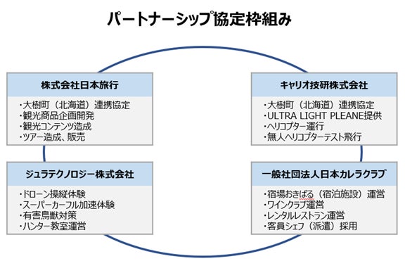 株式会社日本旅行、キャリオ技研株式会社、ジュラテクノロジー株式会社、一般社団法人日本カレラクラブが連携・協同し、HOSPO(北海道スペースポート)等を活用した観光振興および、宇宙のまちづくりに取り組む事により、地域の活性化を図る事を目的とする。