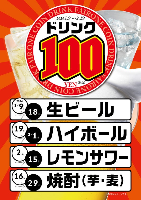 概 要 :期間中入れ替わりで対象のドリンクを、何杯飲んでも1杯100円(税込)でご提供いたします。