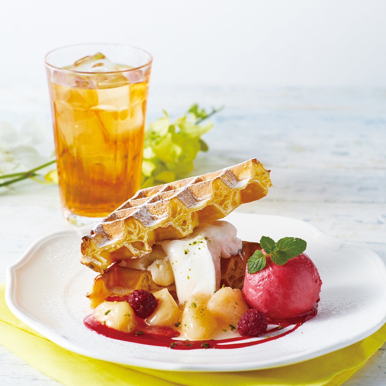 ワッフルにコアントローが香るハニーシロップをたっぷりと染み込ませて、外はカリッと中はしっとりと焼き上げました。白桃ソース、ラズベリーソルベ、カスタードムース、レモンホイップなどを合わせて。