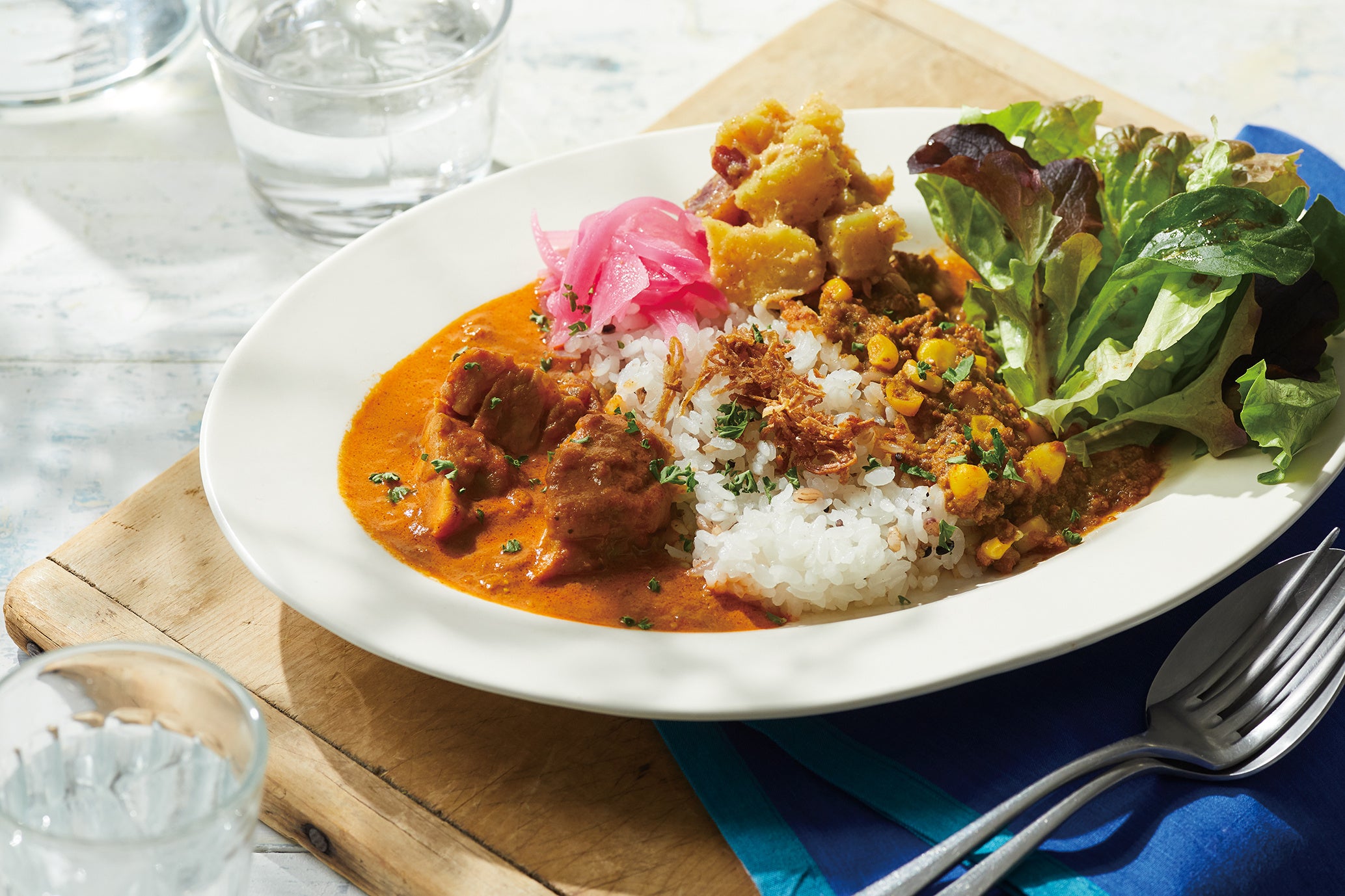 2種類のカレーをミックスしたり、つけ添えのレッドオニオンのデリやさつまいもとチャイスパイスのサラダをカレーと混ぜながら味わったり、自由気ままに“味変”を楽しむのもおすすめです。