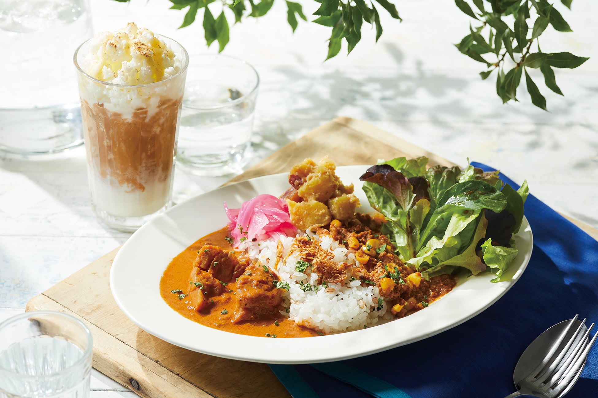 紅茶とも相性ぴったりのスパイス香るカレーは、これまでアフタヌーンティー・ティールームでも期間限定メニューとしてたびたび登場する夏の人気メニュー。この夏は、新作としてAfternoon Tea流のあいがけカレーを提案します。ごろっとしたチキン入りのクリーミーな“トマトカレー”と、北海道産スイートコーンのペーストと蜂蜜を隠し味にスパイスをきかせた“キーマカレー”の2種類が、ワンプレートで楽しめる「トマトチキン&とうもろこしキーマのカレープレート」を発売します。