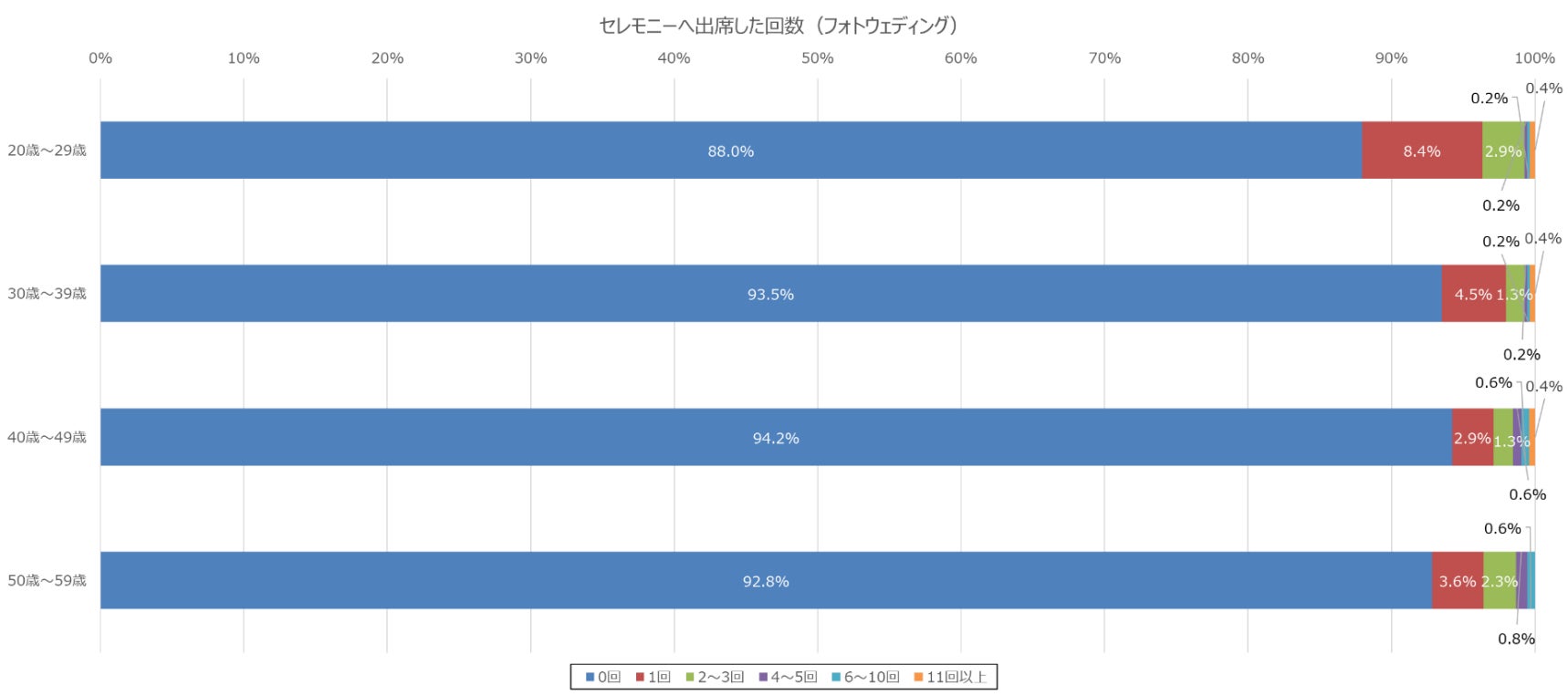 どの年代でも出席「0回」の割合が90%前後となっていますが、20代では12.1%が1回以上出席したことがあると回答しました。家族や親しい友人には一緒に写ってほしいのか、フォトウェディングに出席したことがある20代の割合は、他の年代よりも高くなっていました。
