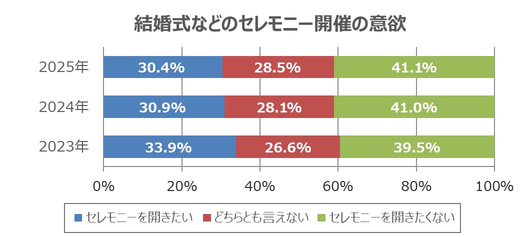 セレモニーを開きたいかどうか、「考えたことがない」(n=455)、「そもそも結婚したいという意欲がない」(n=795)、「分からない/答えたくない」(n=385)という回答者を除いて集計(n=771)したところ、「セレモニーを開きたい」(30.4%)、「どちらとも言えない」(28.5%)、「セレモニーを開きたくない」(41.1%)という結果になりました。