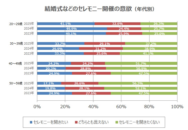 一方で、20代でセレモニーを「開きたい」と答えた割合が前年比で8.8ポイント減少しています。ただ、「どちらとも言えない」が8.2ポイント増えていることから、結婚式に費用をかけることに慎重になる人が増えているのかもしれません。なお、50代では2023年が24.9%、2024年が19.8%、2025年が17.1%と、セレモニーを「開きたい」割合が年々減ってきています。