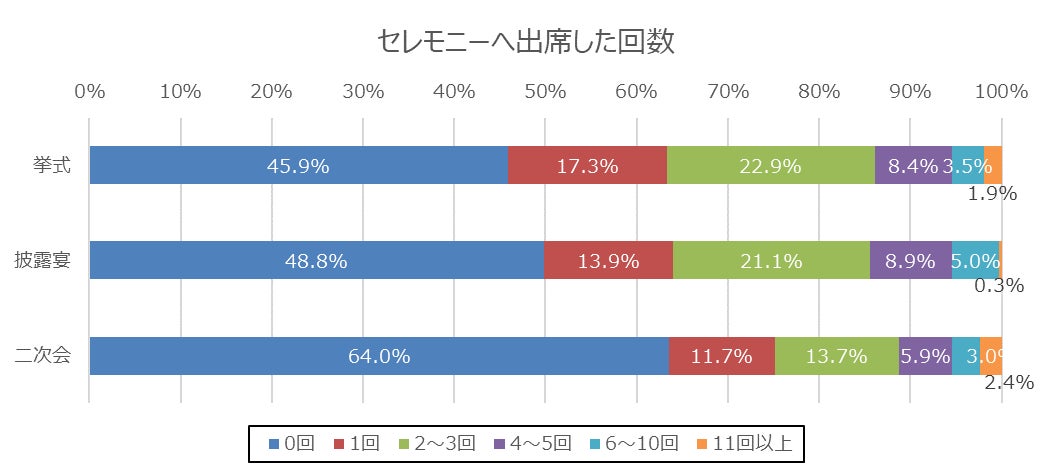いずれも「0回」という回答が最も多くなり、4回以上出席したことがある割合は「挙式」(13.8%)、「披露宴」(14.2%)、「二次会」(11.3%)と少数にとどまりました。