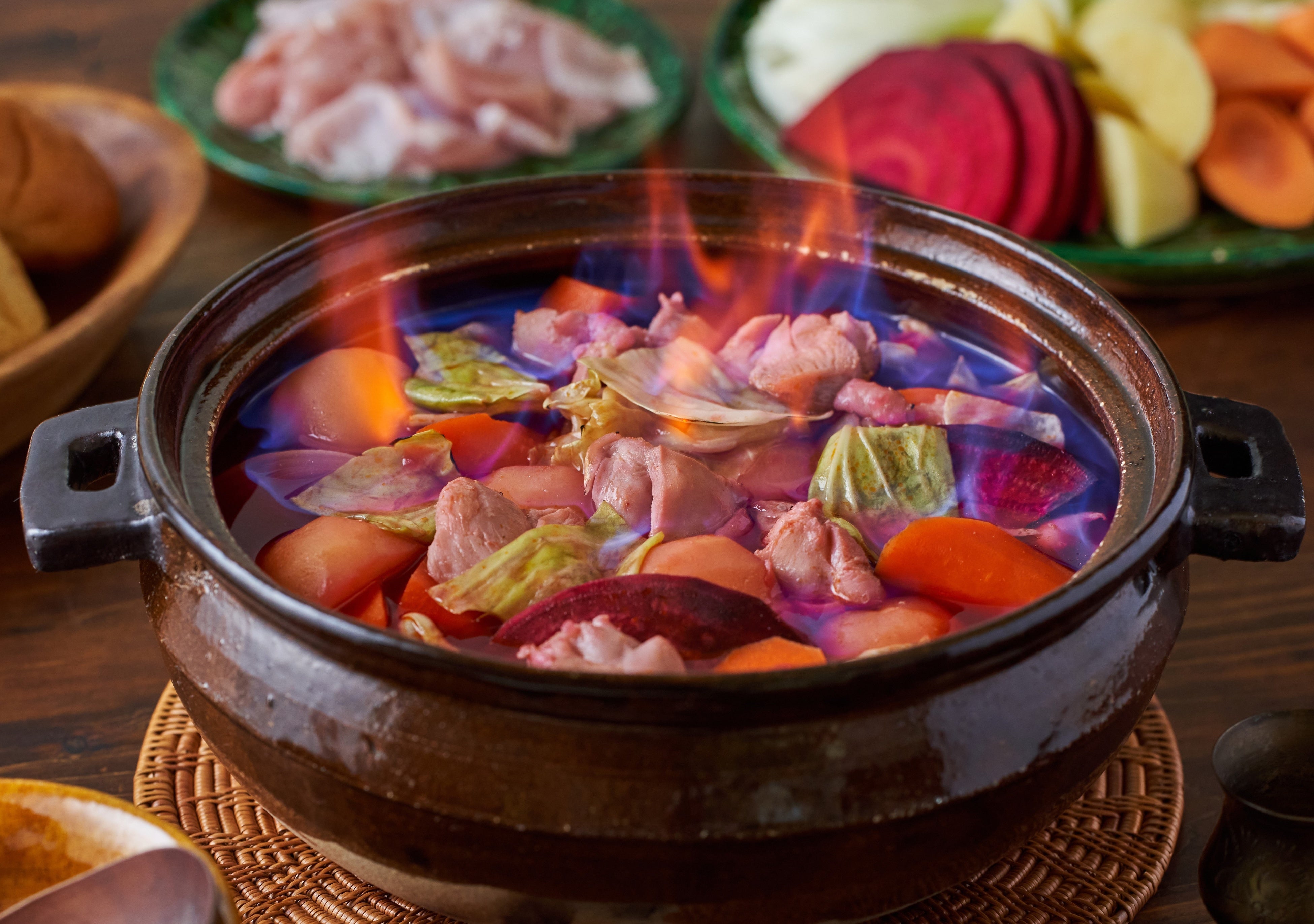 ウクライナ発祥の郷土料理「ボルシチ」を、農家さんが作るような野菜たっぷりの鍋にアレンジ。生のビーツを使用し、本格的ながら誰でも美味しく食べられる味わいに仕上げました。食べる直前にウォッカを流し入れ、フランベすれば完成です。