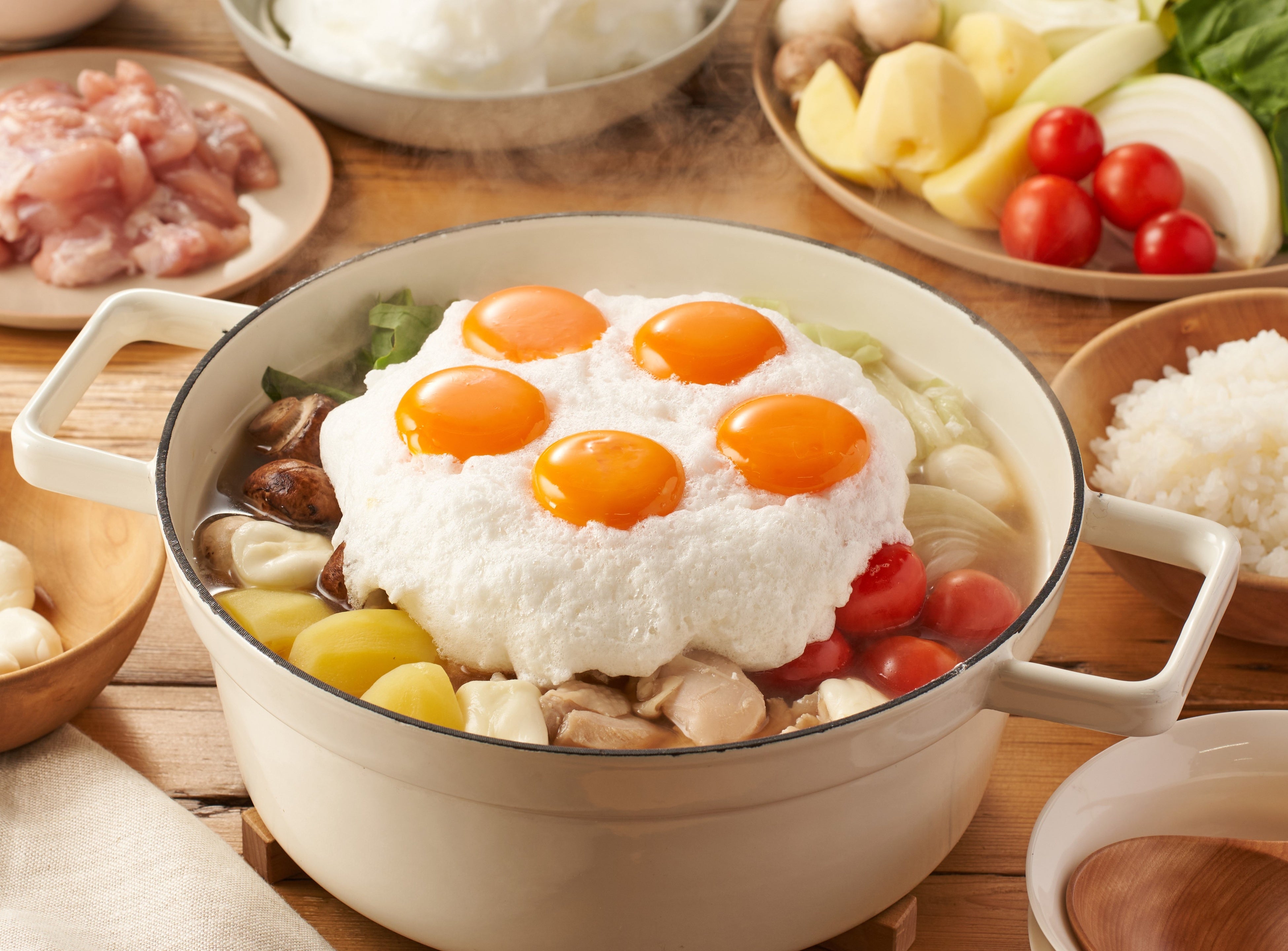 チキンをベースにアンチョビの旨味を追加したまろやかなスープに、鮮やかな彩りの野菜をたっぷり使用。メレンゲが口の中でしゅわっと溶けてなくなる新食感が楽しめます。お子さまがメレンゲ作りをお手伝いできるなど、食卓が盛り上がる一品です。