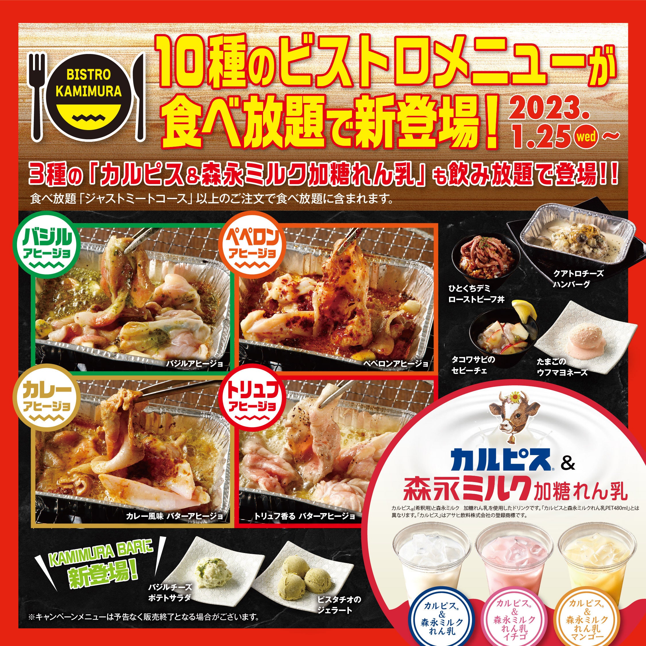 この度の「ビストロかみむら」メニューとして新登場するメニューは、「トリュフ香るバターアヒージョ」「カレー風味バターアヒージョ」「ぺペロンアヒージョ」「バジルアヒージョ」といった4種のアヒージョをはじめ、「クアトロチーズハンバーグ」「たまごのウフマヨネーズ」「タコワサビのセビーチェ」「ひとくちデミローストビーフ丼」、またサラダやナムル・キムチがビュッフェ形式でお楽しみいただくことができる「KAMIMURA BAR」への追加ラインナップとして「バジルチーズポテトサラダ」と「ピスタチオのジェラート」といった計10種のビストロメニューと、さらにプレーン・イチゴ・マンゴーといった3種の「カルピス&森永ミルク加糖れん乳」です。これら「ビストロかみむら」メニューは「ジャストミートコース」以上の食べ放題コースでもご注文いただくことができるため、食べ放題コースをご注文いただいたお客様は食べ飲み放題としてお楽しみいただくことができます。