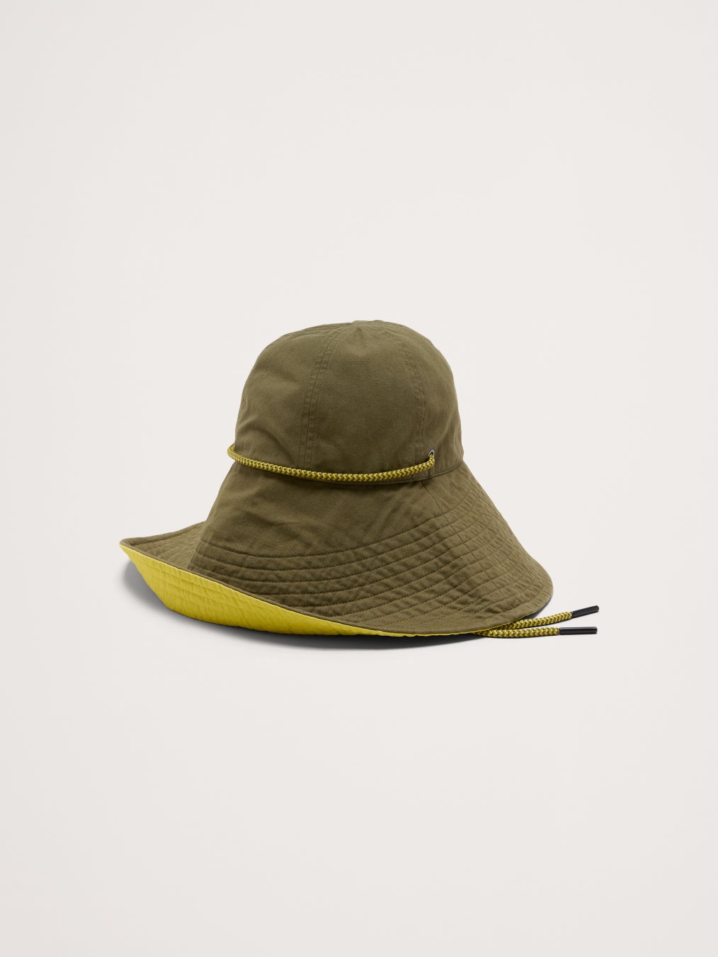 コットンキャンバス サン ハット(12,000円): 広めのつばで日差しを遮りつつ、内側の差し色がさりげないアクセントとして効いた、機能性とデザイン性を兼ね備えたハット。