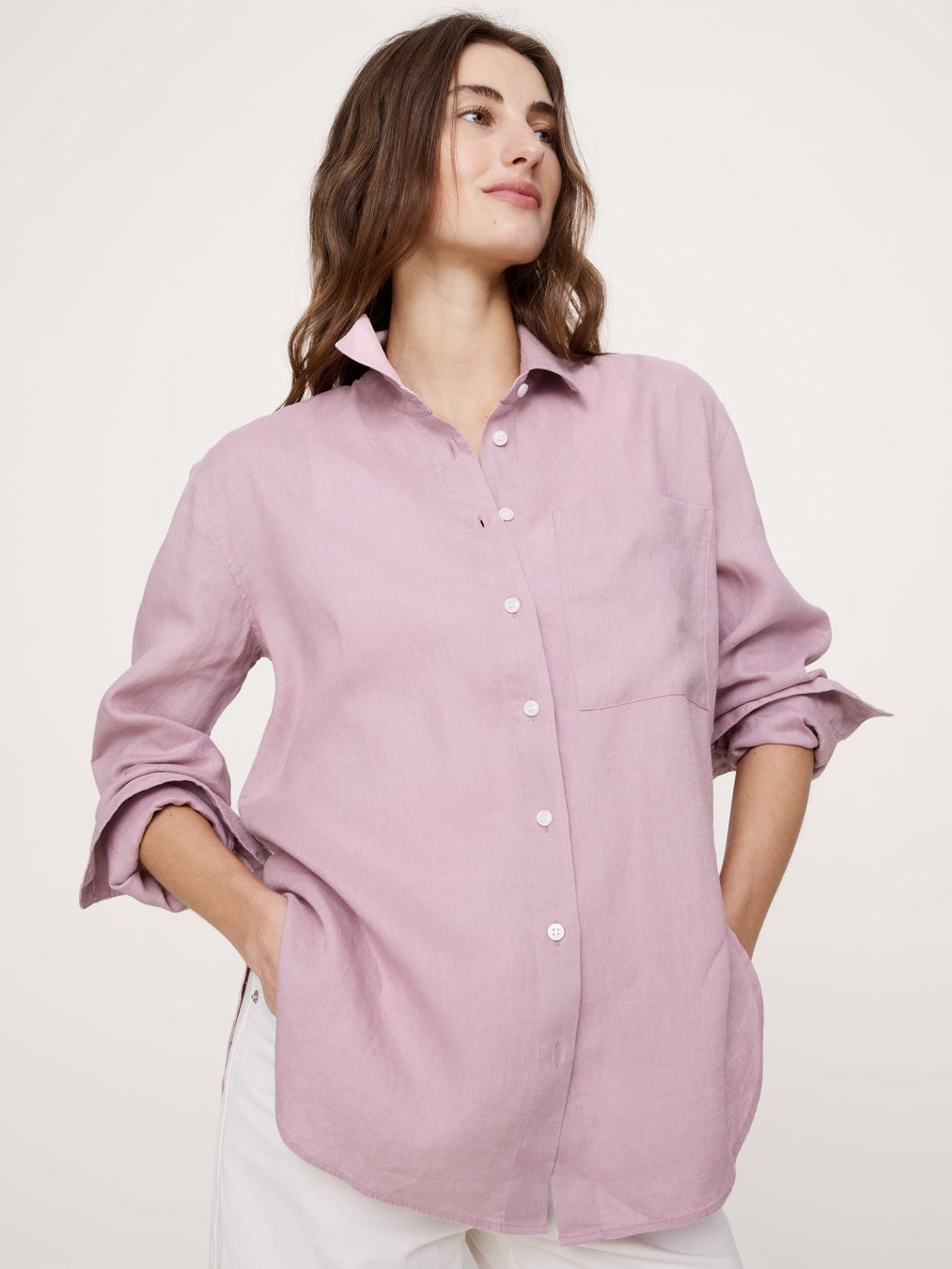 オーバーサイズ リネンシャツ(15,000円):上品な質感と通気性に優れたヨーロッパ産リネン100%で仕立てたシャツ。