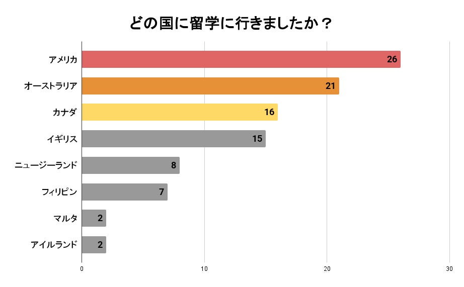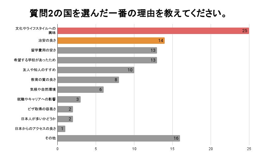 となりました。「文化やライフスタイルへの興味」「治安の良さ」「留学費用の安さ」が重視されていることが分かりました。