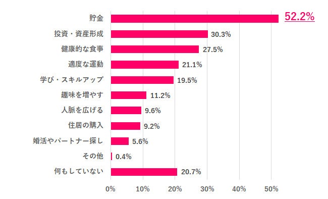 老後の不安を解消するためにしていることの1位は「貯金」で、52.2%でした。2位は「投資・資産形成」(30.3%)で、お金の不安に対する対策をしている人が目立ちます。また、「健康的な食事」(27.5%)、「適度な運動」(21.1%)など、健康を維持するための取り組みも上位でした。