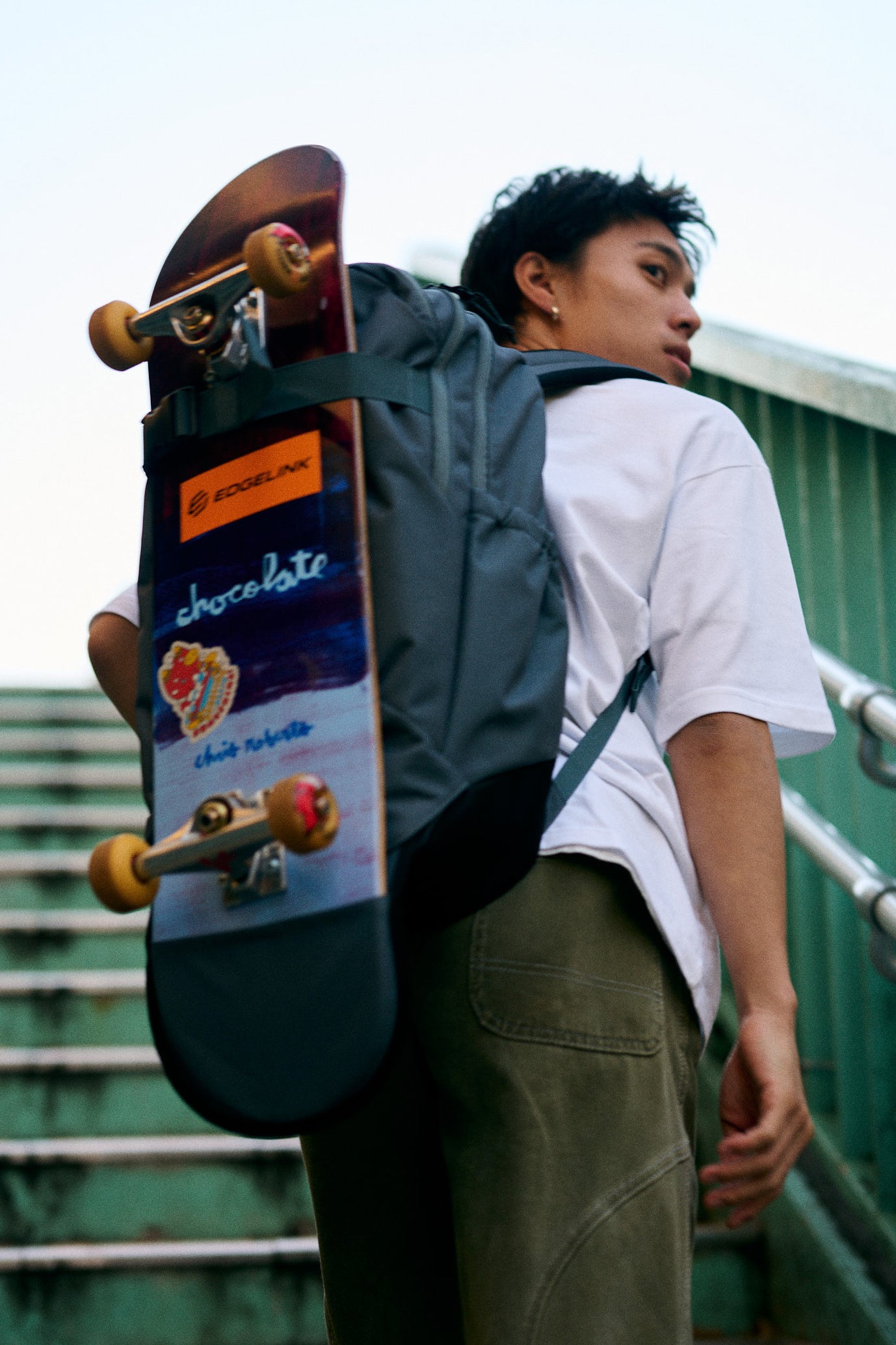 エッジリンク独自開発のスケートボードホルダーを搭載したリュック。