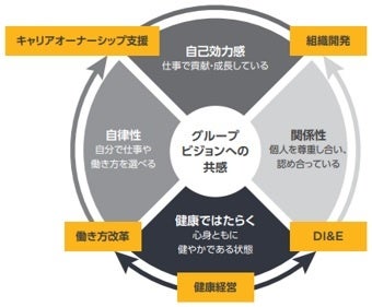パーソルグループでは、社員の「はたらいて、笑おう。」の実現のために社員エンゲージメントの向上に注力しています。「自律性」「自己効力感」「関係性」「健康」「ビジョンへの共感」の5つの要素をエンゲージメントドライバーと位置づけ、それに基づいた施策を展開しています。