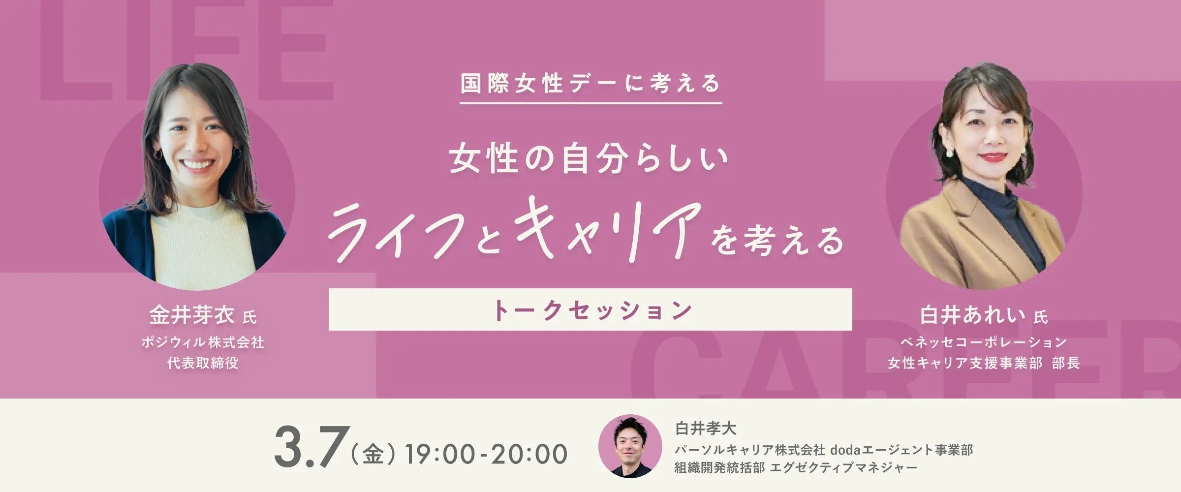 そこで、転職サービス「doda」は、一人でも多くのはたらく女性が、自らが望むキャリアを描き、選択できるようにサポートしたいという想いから、3月の国際女性デーに合わせて、キャリアのパーソナルトレーニングサービス「POSIWILL CAREER(ポジウィルキャリア)」を運営するポジウィル株式会社と、ベネッセの女性キャリア形成サービス「withbatons(ウィズバトンズ)」を運営するベネッセコーポレーションと共同で、はたらく女性向けのオンラインイベントを開催する運びとなりました。