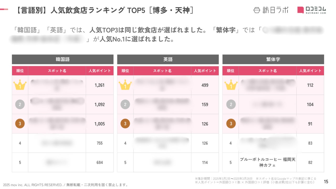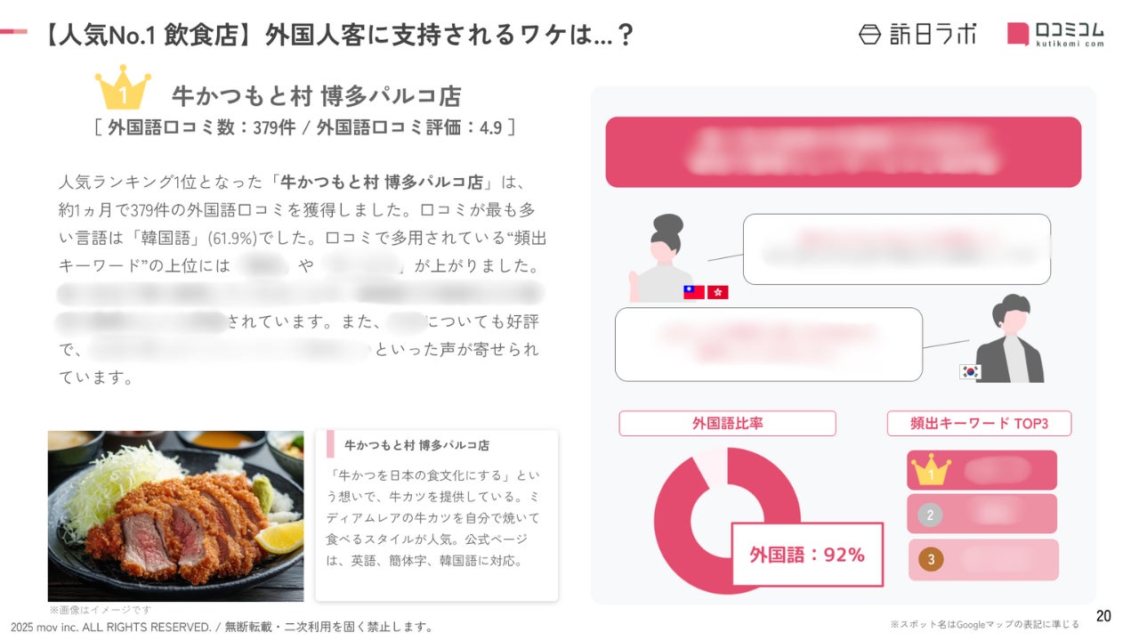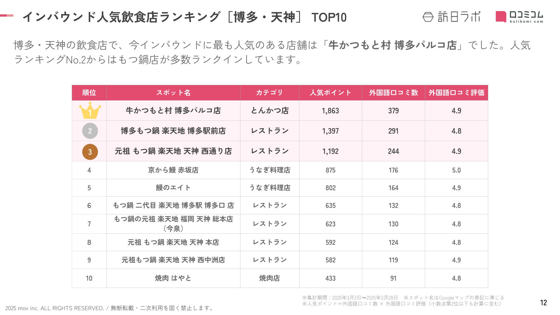 業界最大級のインバウンドビジネスメディア「訪日ラボ」及び 店舗向け集客一元化プラットフォーム「口コミコム」を運営する株式会社mov(代表取締役:渡邊 誠、本社:東京都渋谷区、以下mov)は、博多・天神エリアの飲食店に寄せられた最新の口コミデータから、独自の『インバウンド人気飲食店ランキング』を発表しました。