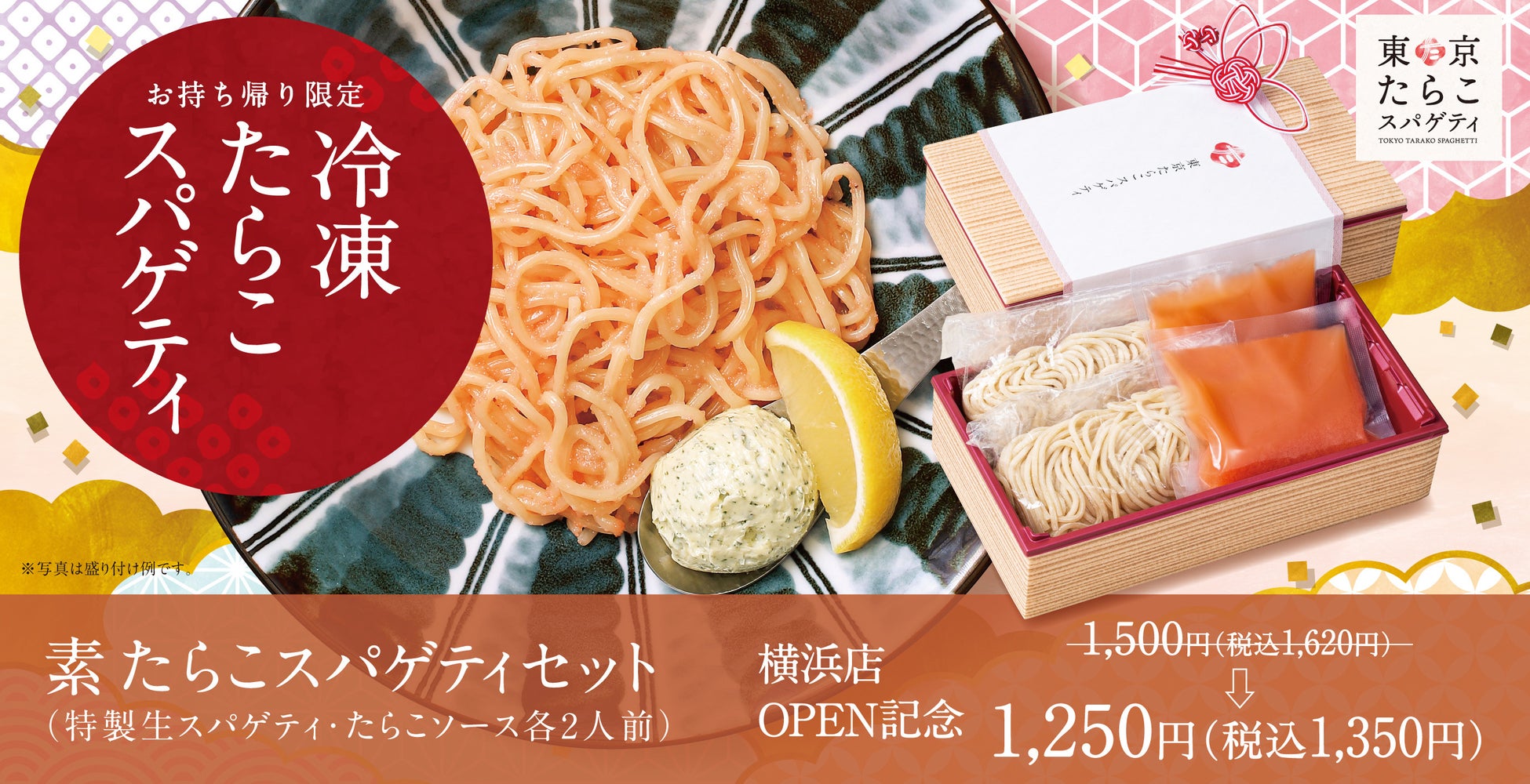 横浜店のOPENを記念して、渋谷/原宿/南池袋を含む東京たらこスパゲティ全店でお持ち帰り限定の冷凍たらこスパゲティ「素たらこスパゲティセット」を、2023年6月30日(金)~7月31日(月)の期間中お得な1,250円(税込1,350円)で販売いたします。