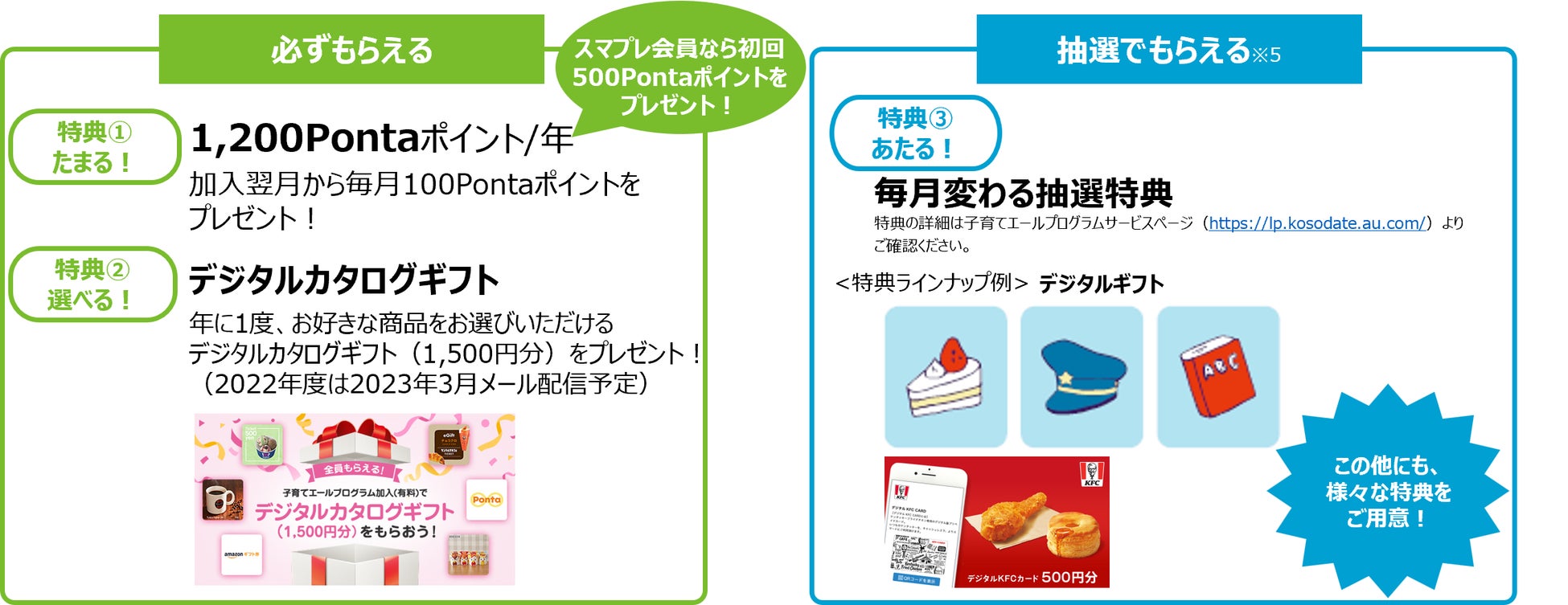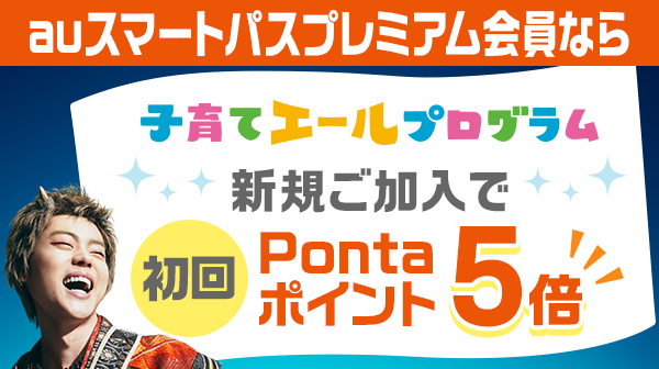 - 概要:「auスマートパスプレミアム」会員が、期間中に「子育てエールプログラム」に新規ご加入いただくと*1、初回のPontaポイントを5倍(500Pontaポイント)*2プレゼント