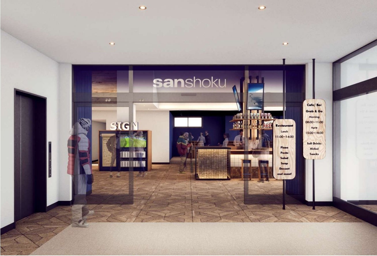 ゲレンデ山麓にあるレストラン「sanshoku」は、朝のコーヒーブレイク、倶知安産のじゃがいも「きたあかり」などの地元野菜を使ったパスタランチ、地ビールとワインが楽しめる夕方のバーカウンターなど、山の魅力を提供しながら時間帯ごとに表情を変える「三食」と「山食」の融合型ダイニングです。