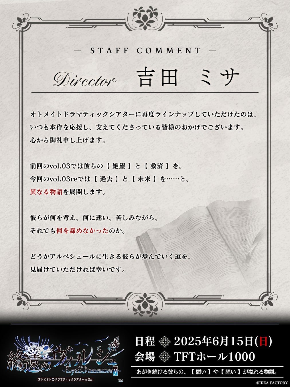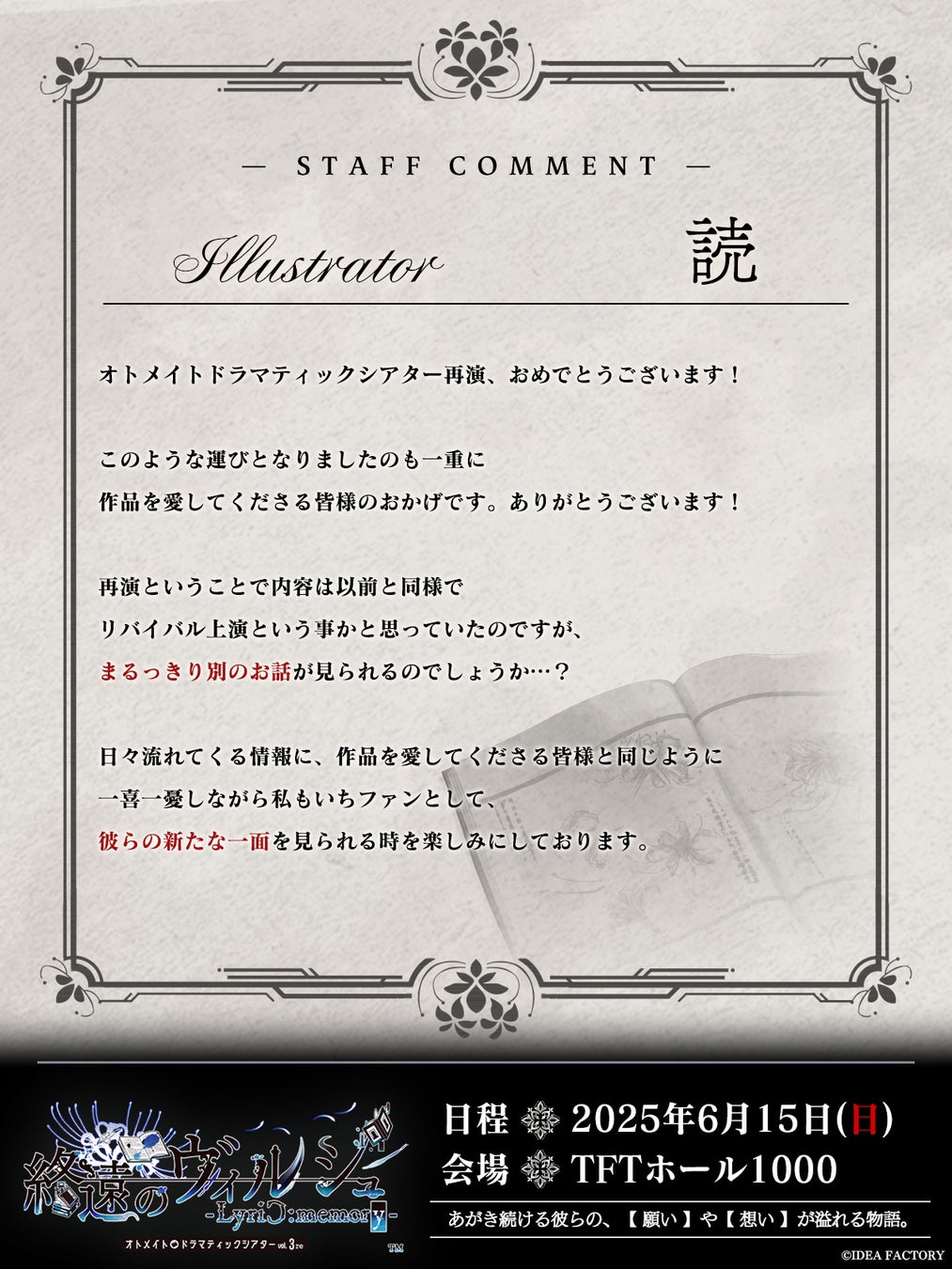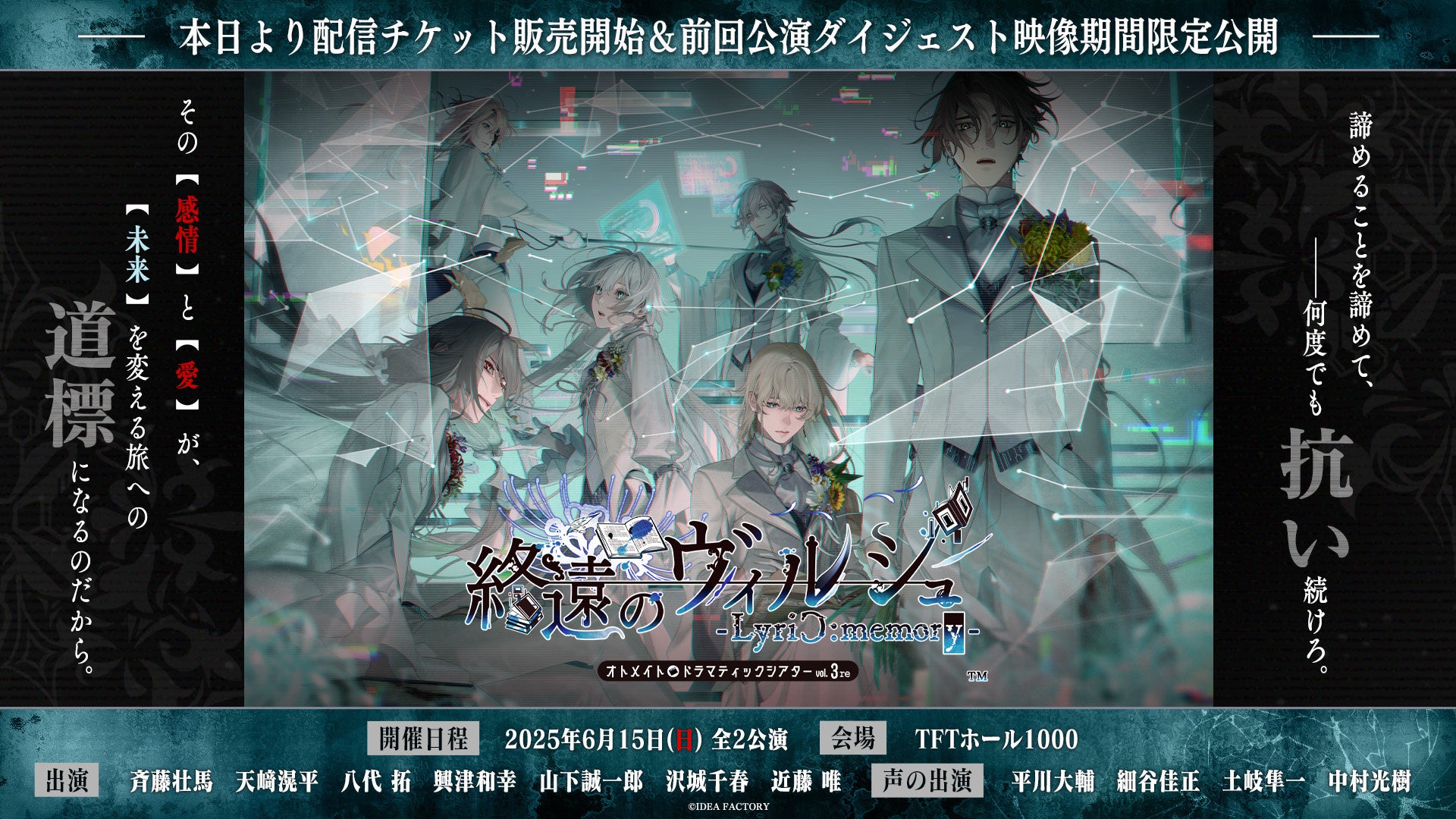 アイディアファクトリー株式会社(代表取締役社長:佐藤 嘉晃/所在地:東京都豊島区)の女性向けゲームブランド「オトメイト」は、2025年6月15日(日)に開催するオトメイトドラマティックシアターvol.03re「終遠のヴィルシュ -LyriC:memory-」の配信チケット情報を公開いたしました。